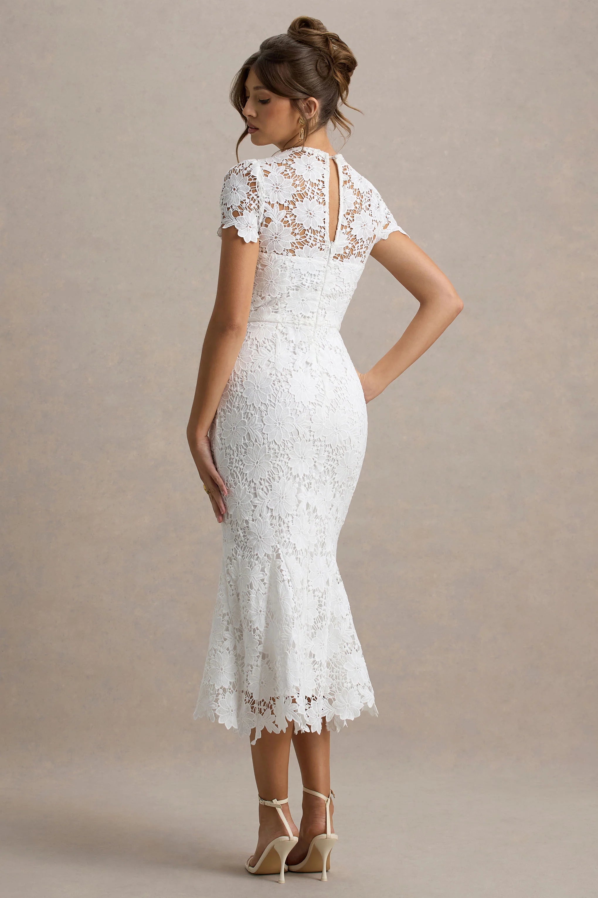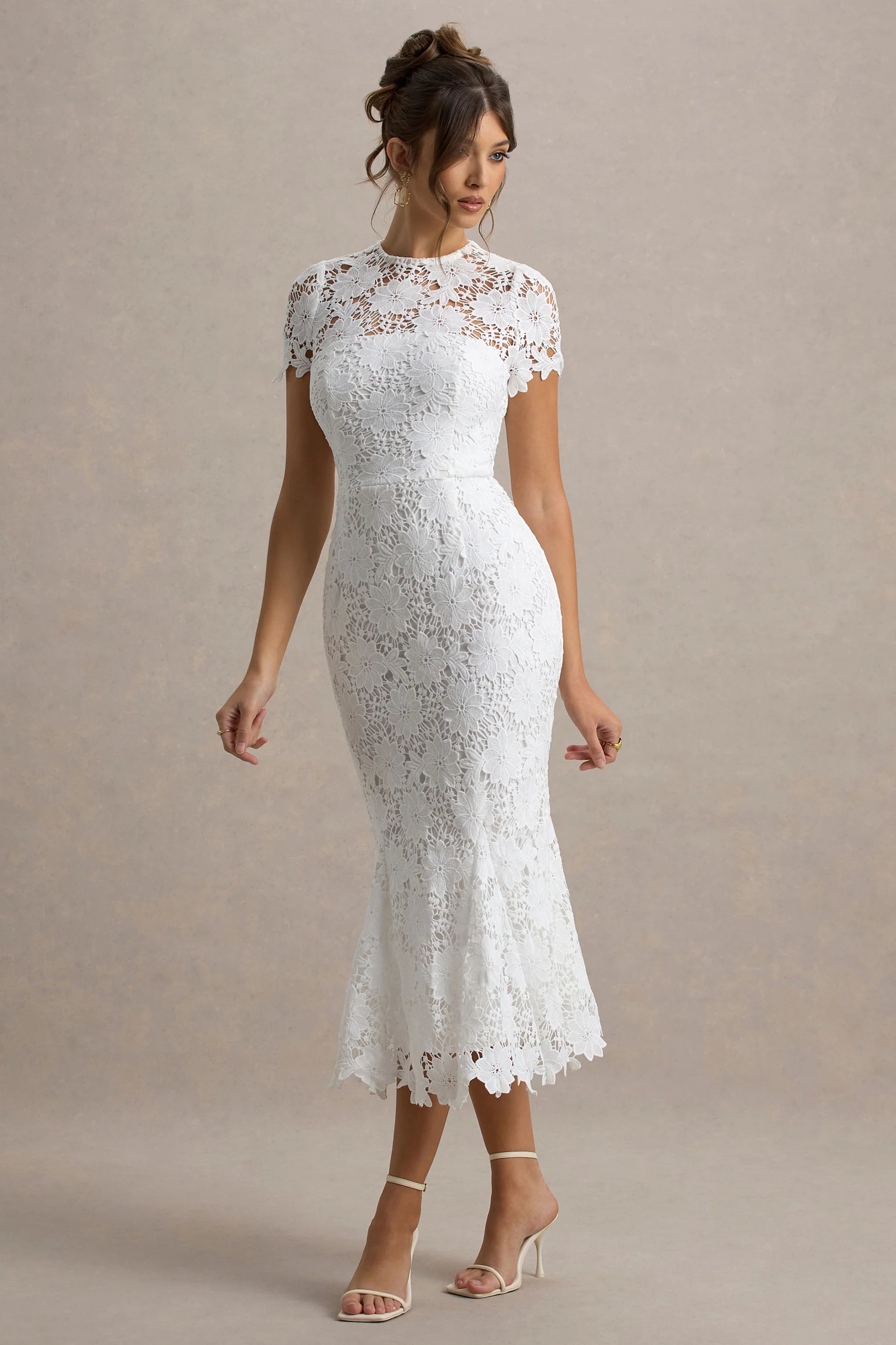 A vision of elegance, Clarissa is the definition of timeless sophistication. Designed in our premium white lace, this stunning midi dress strikes the perfect balance between romance and allure. The high neckline and cap sleeves create a refined, feminine finish, while the sculpting silhouette skims your curves beautifully. Whether you're attending a black tie event or an intimate evening affair, Clarissa ensures you make an unforgettable entrance. Style with sleek heels for an effortlessly polished ensemble.