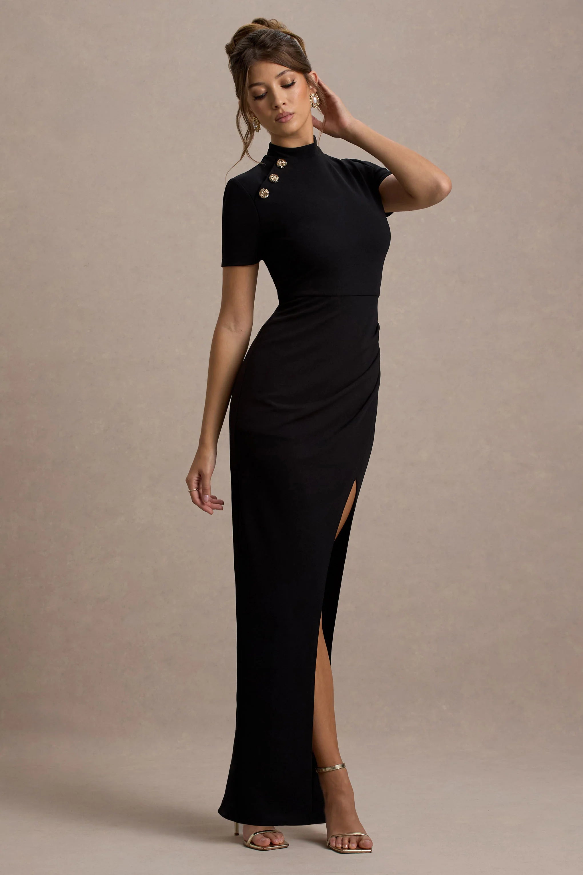 Designed to take you from day to night, Claudetta is a versatile addition to every closet. Crafted in a classic black shade of our premium scuba crepe, this maxi dress is defined by a demure high neckline, short sleeves and glistening gold buttons. Compliment Claudetta further with some court heels like Covergirl.