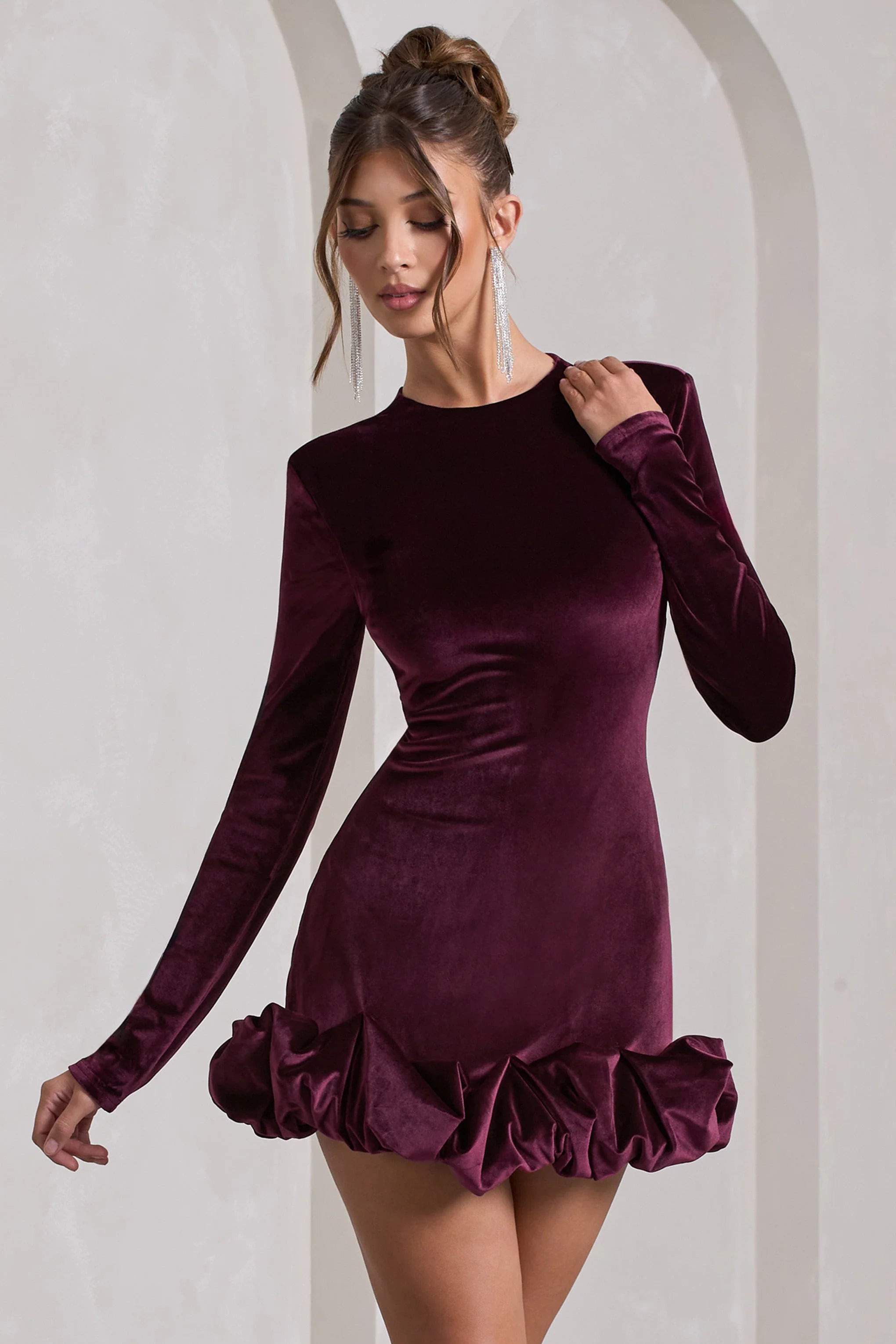 Opt for opulence at your next social event in our port mini dress, Claudine. Crafted in our signature stretch velvet, this long-sleeved bodycon is characterised by an extravagant display of ruffles along its hemline. Keep Claudine at the forefront during your next birthday soiree by pairing it with a sleek bun and gold accents.