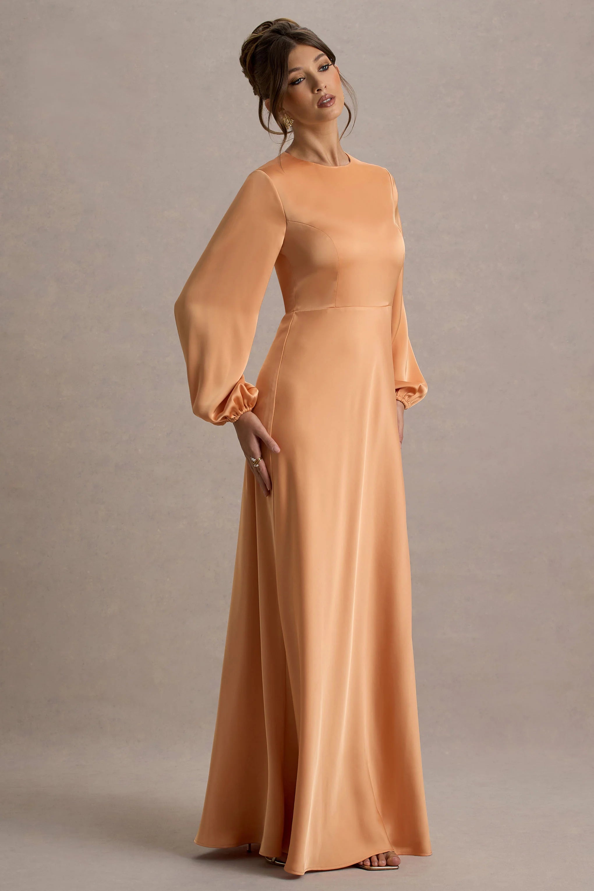Introducing a new crowd pleaser for the occasion season, Crawley. Crafted from the finest of premium stretch satin, this peach coloured puff-sleeve maxi gown is enough to make a statement whatever the event. Boasting volume from shoulders to hem, Crawley can be styled effortlessly with smooth waves and bold earrings when attending your best friend's wedding or attending a black-tie gala.