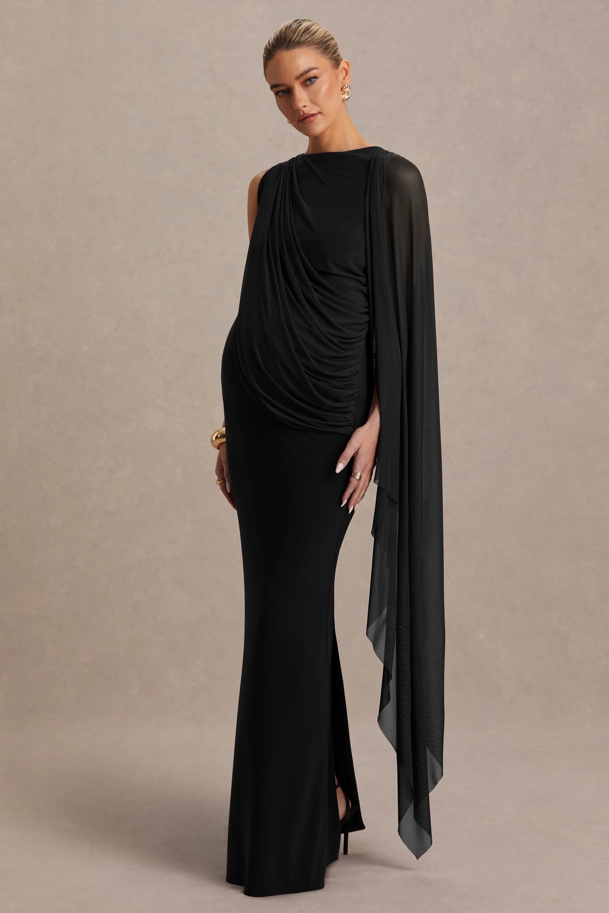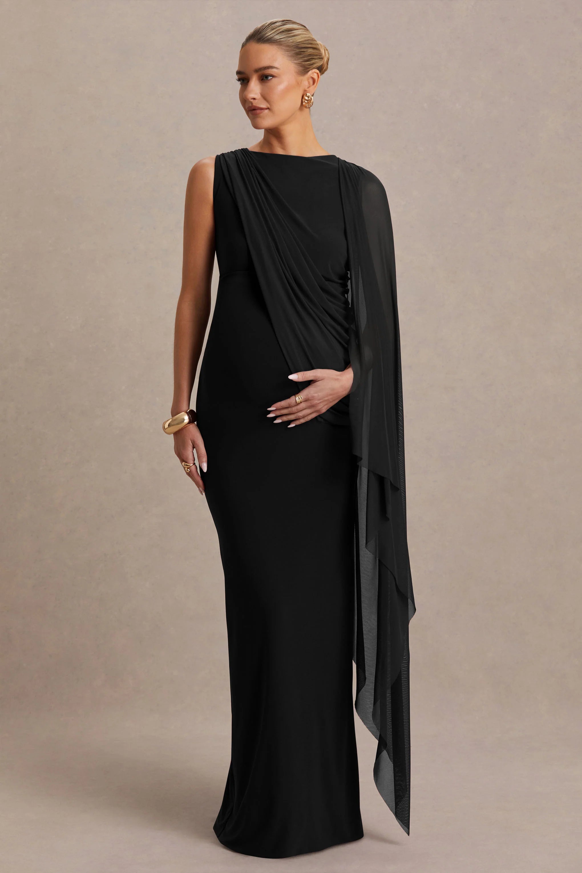 Say hello to Cristina, a maternity showstopper designed for elegance and ease. Crafted from our black premium stretch jersey, this maxi dress flatters your growing bump with ruched detailing and a flawless fit. The high neckline exudes sophistication, while the asymmetric cape overlay adds soft movement and a touch of modern drama. Effortlessly chic and endlessly flattering, Cristina is the perfect choice for glamorous maternity moments.