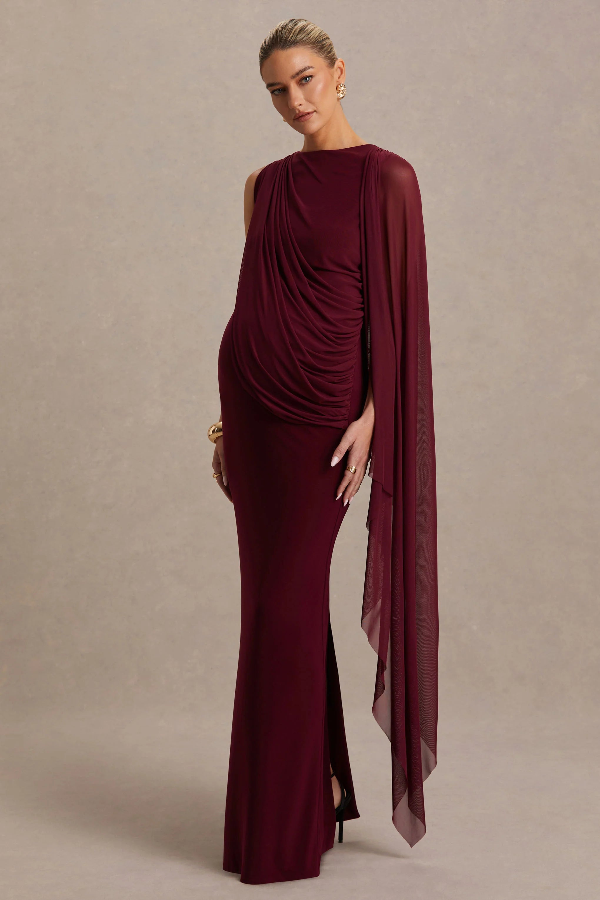 Say hello to Cristina, a maternity showstopper designed for elegance and ease. Crafted from our burgundy premium stretch jersey, this maxi dress flatters your growing bump with ruched detailing and a flawless fit. The slashed neckline exudes sophistication, while the asymmetric cape overlay adds soft movement and a touch of modern drama. Effortlessly chic and endlessly flattering, Cristina is the perfect choice for glamorous maternity moments.
