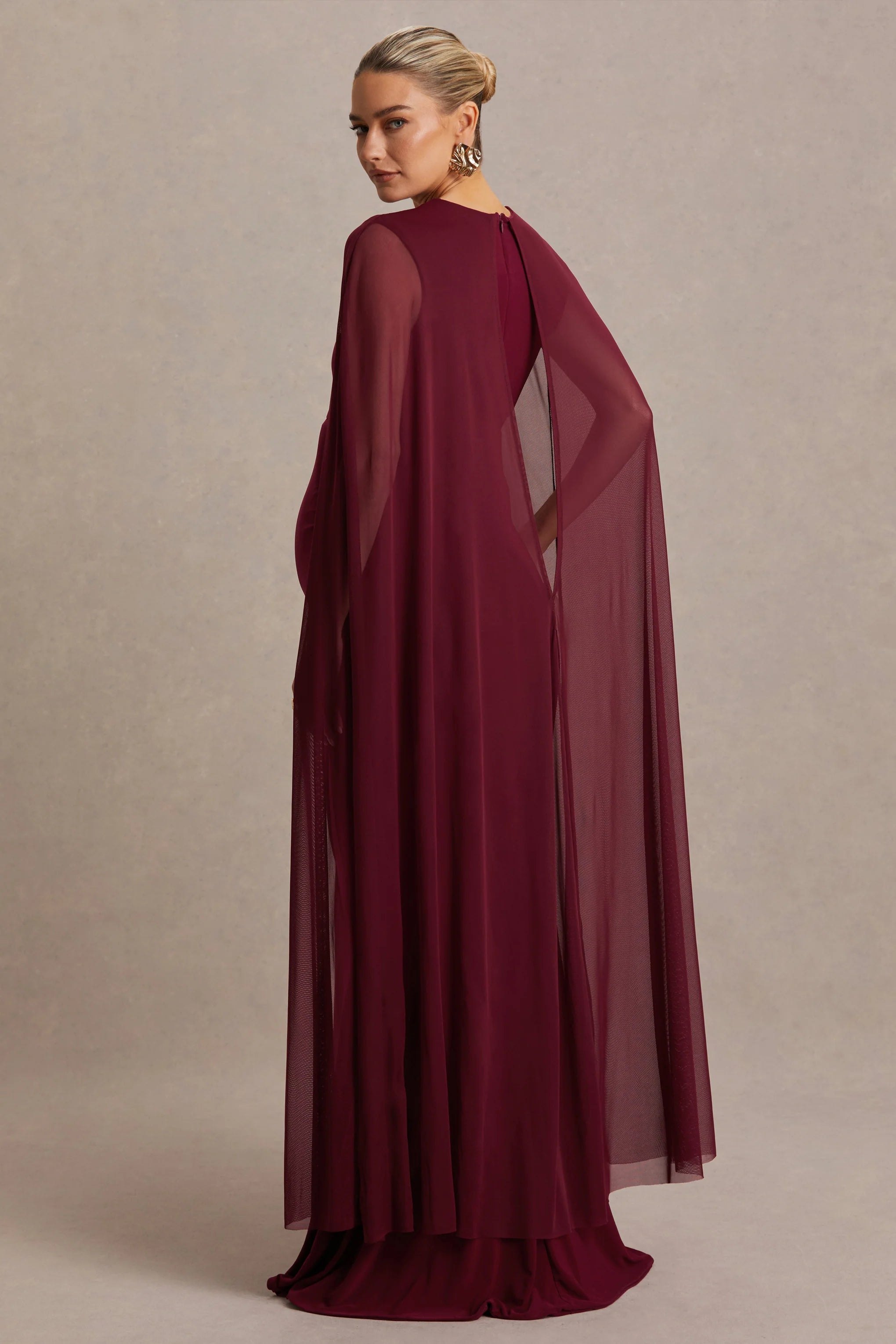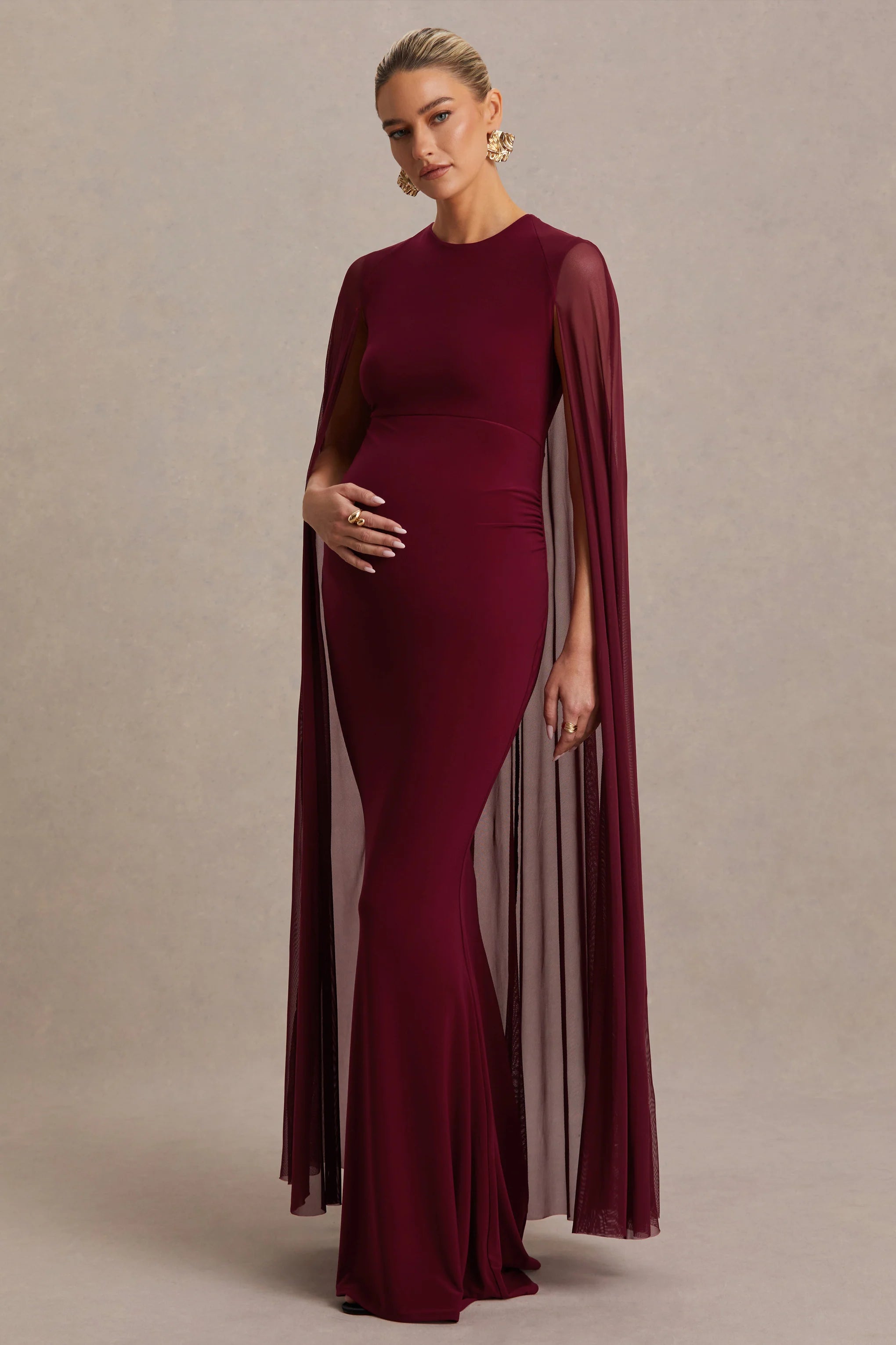 Captivate the room with elegance in our latest showstopper, Currant. This maxi is cut in an enchanting berry hue of our premium stretch jersey, giving you the ultimate, figure flattering fit. Designed with a chic high neckline and a delicate, yet striking, mesh cape that'll turn heads at your next upscale occasion. Finished with ruched detailing that is mindfully placed to enhance your figure, whilst maximising comfort. From weddings to glamorous galas, in this show stopper you will have all eyes on you.