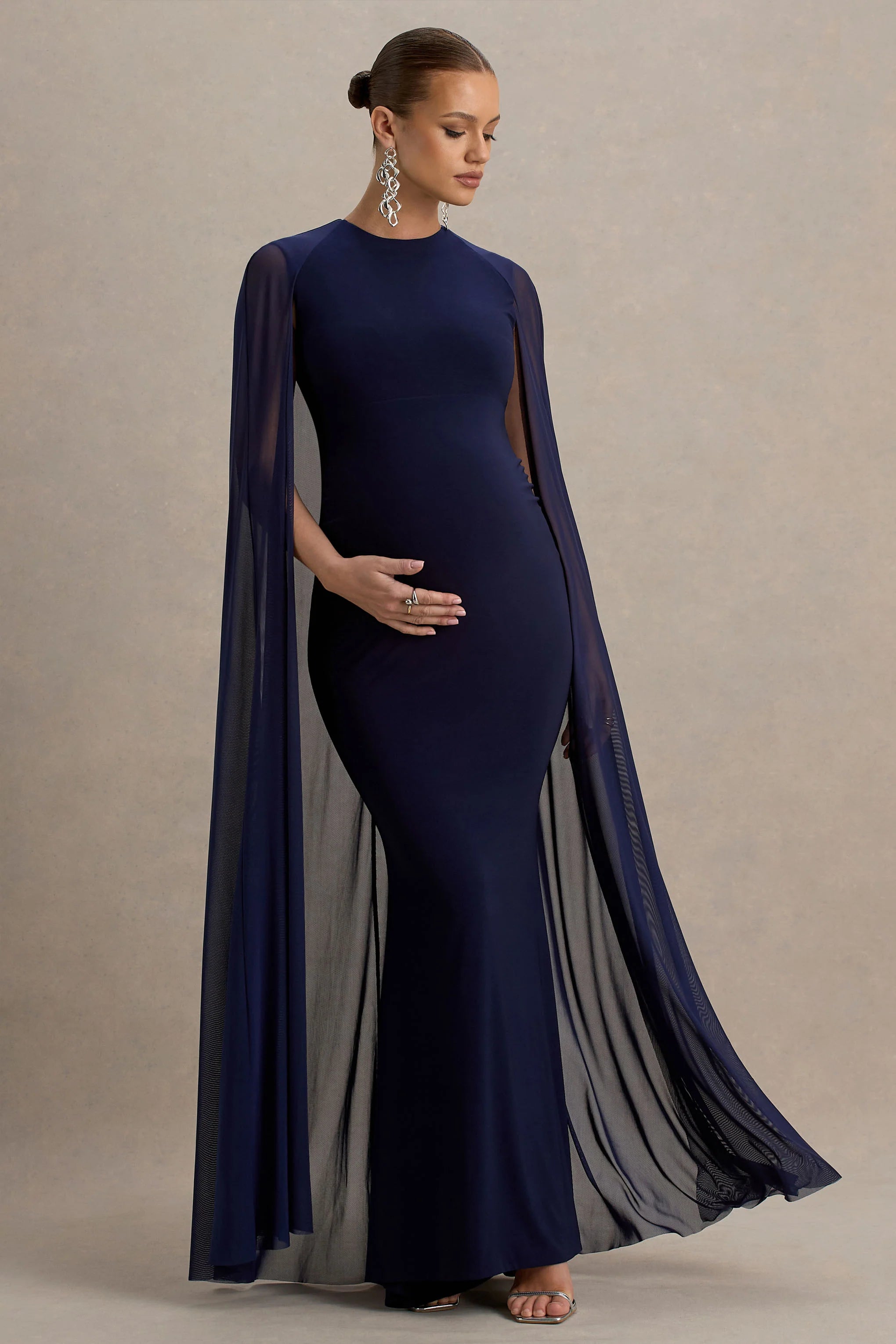 Captivate the room with elegance in our latest showstopper, Currant. This maxi is cut in an enchanting navy hue of our premium stretch jersey, giving you the ultimate, figure flattering fit. Designed with a chic crew neckline and a delicate, yet striking, mesh cape that'll turn heads at your next upscale occasion. Finished with ruched detailing that is mindfully placed to enhance your figure, whilst maximising comfort. From weddings to glamorous galas, in this show stopper you will have all eyes on you.