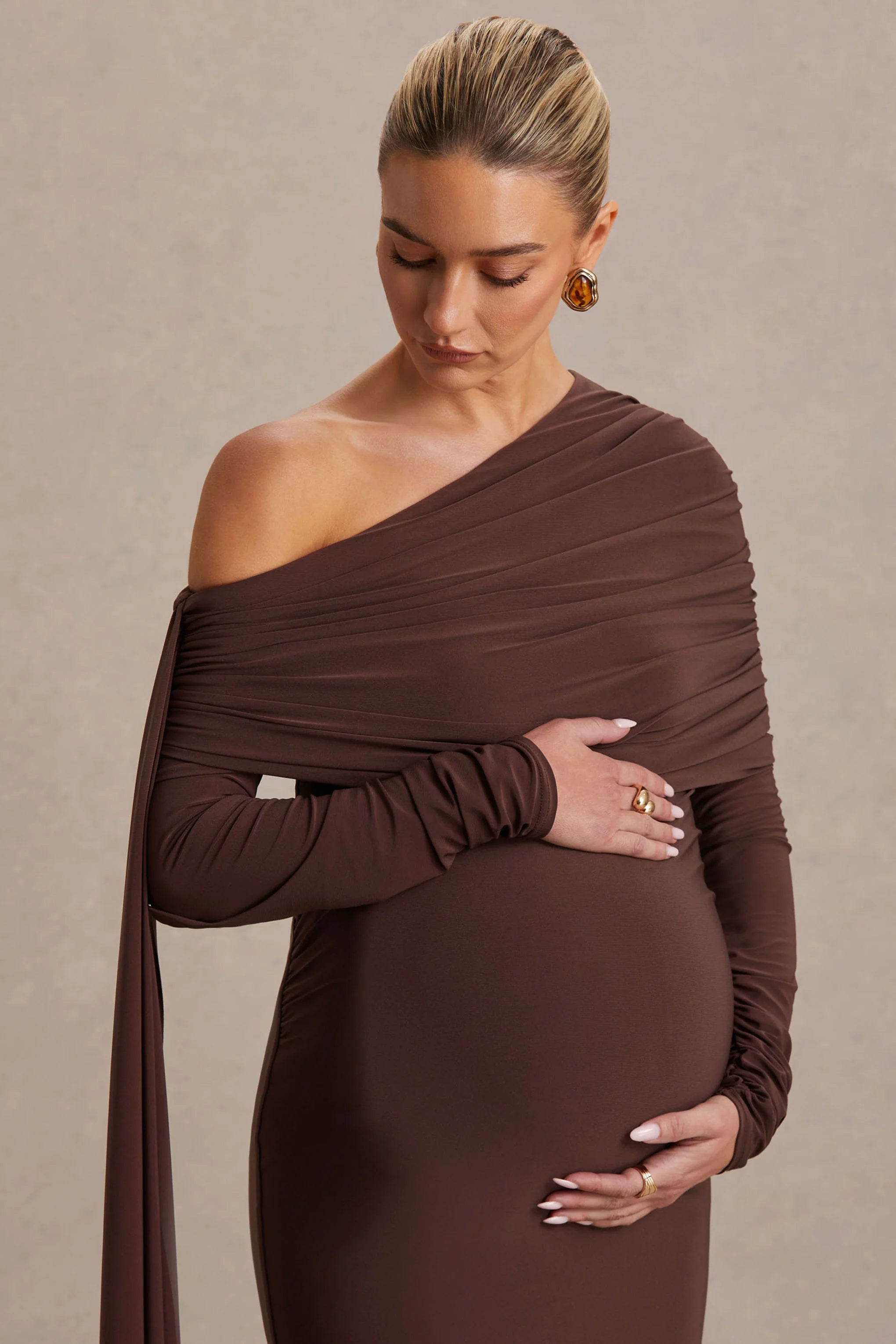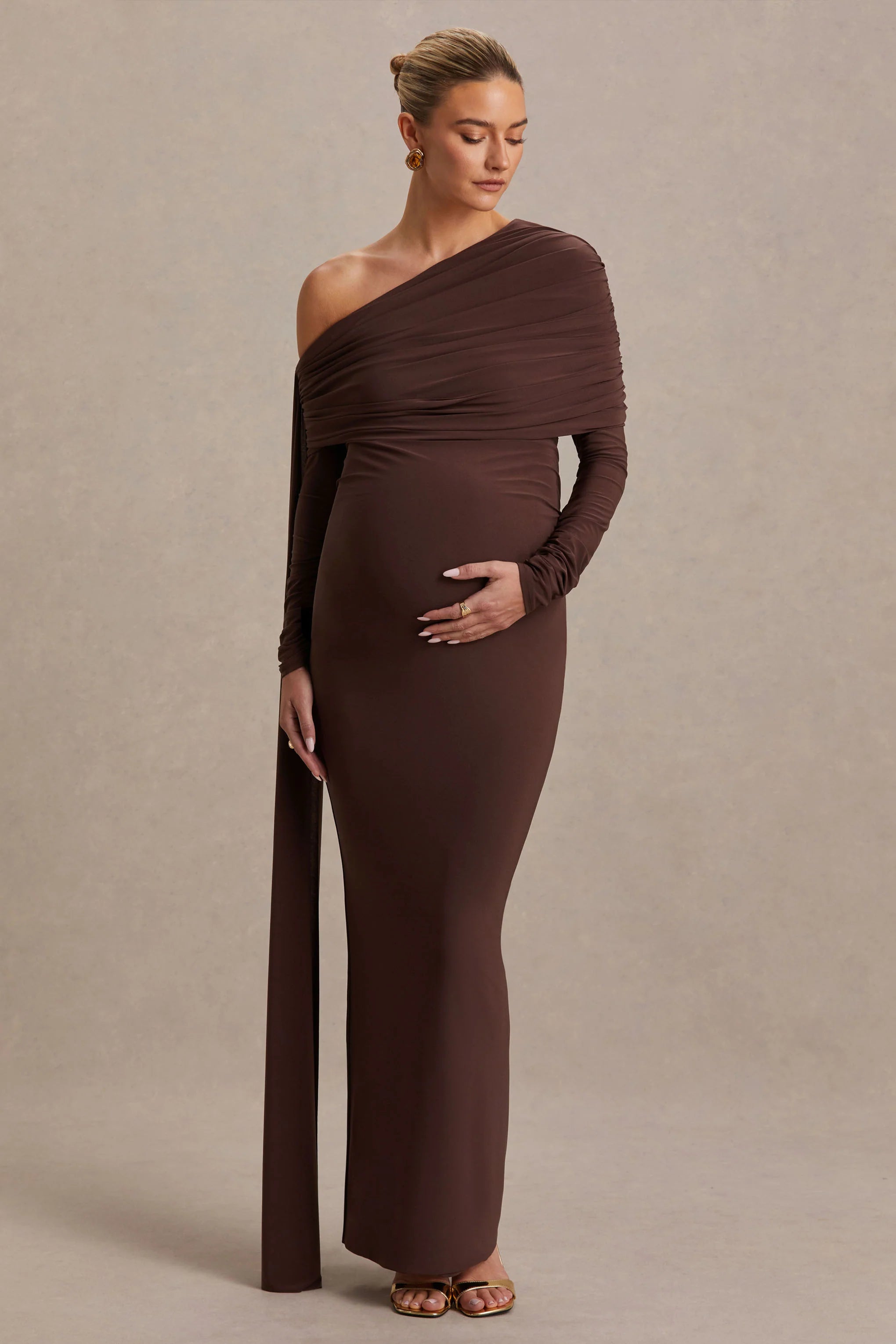 Cyra is sophistication with a sultry edge, designed to make an unforgettable statement. Crafted from our premium stretch jersey in a rich brown, this maxi dress skims the body beautifully, offering a smooth and flattering fit. The bardot neckline frames the shoulders with elegance, while ruched detailing adds texture and dimension. Finished with a sweeping sash that drapes effortlessly, Cyra is the perfect mix of timeless glamour and allure.