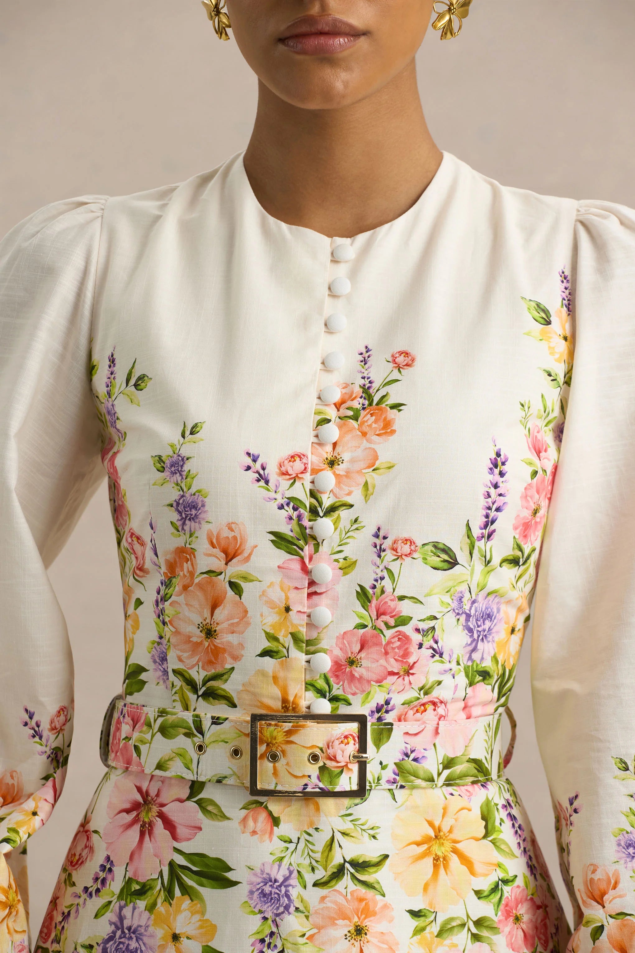 Meet Dahlia, a charming, timeless, and effortlessly chic must-have. Crafted in our premium linen-look fabric, in a white floral border print that blooms across this midi dress. The crew neckline and delicate button detailing offer a refined edge, while the statement gold belt buckle cinches the waist for a flattering, feminine silhouette. From garden parties to race days, Dahlia is the definition of elevated daywear.