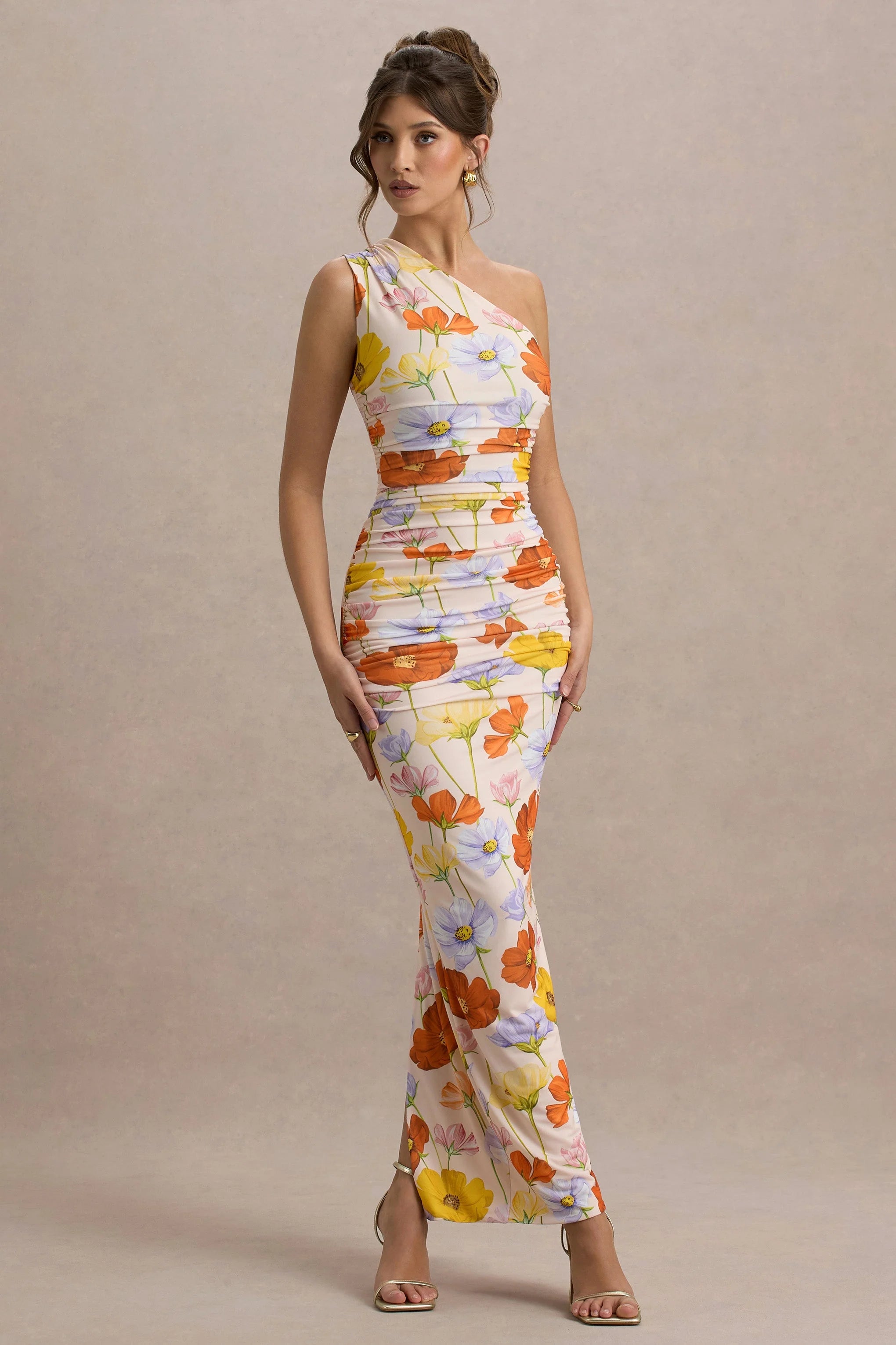 A core wardrobe essential, captivate from all angles in Dalarie. Designed in our dual-layered jersey renowned for its sculpting capabilities, this bright floral print maxi dress is further enhanced by full body ruching. Compliment its asymmetric neckline with a simple sleek bun and glistening earrings for your next date night.