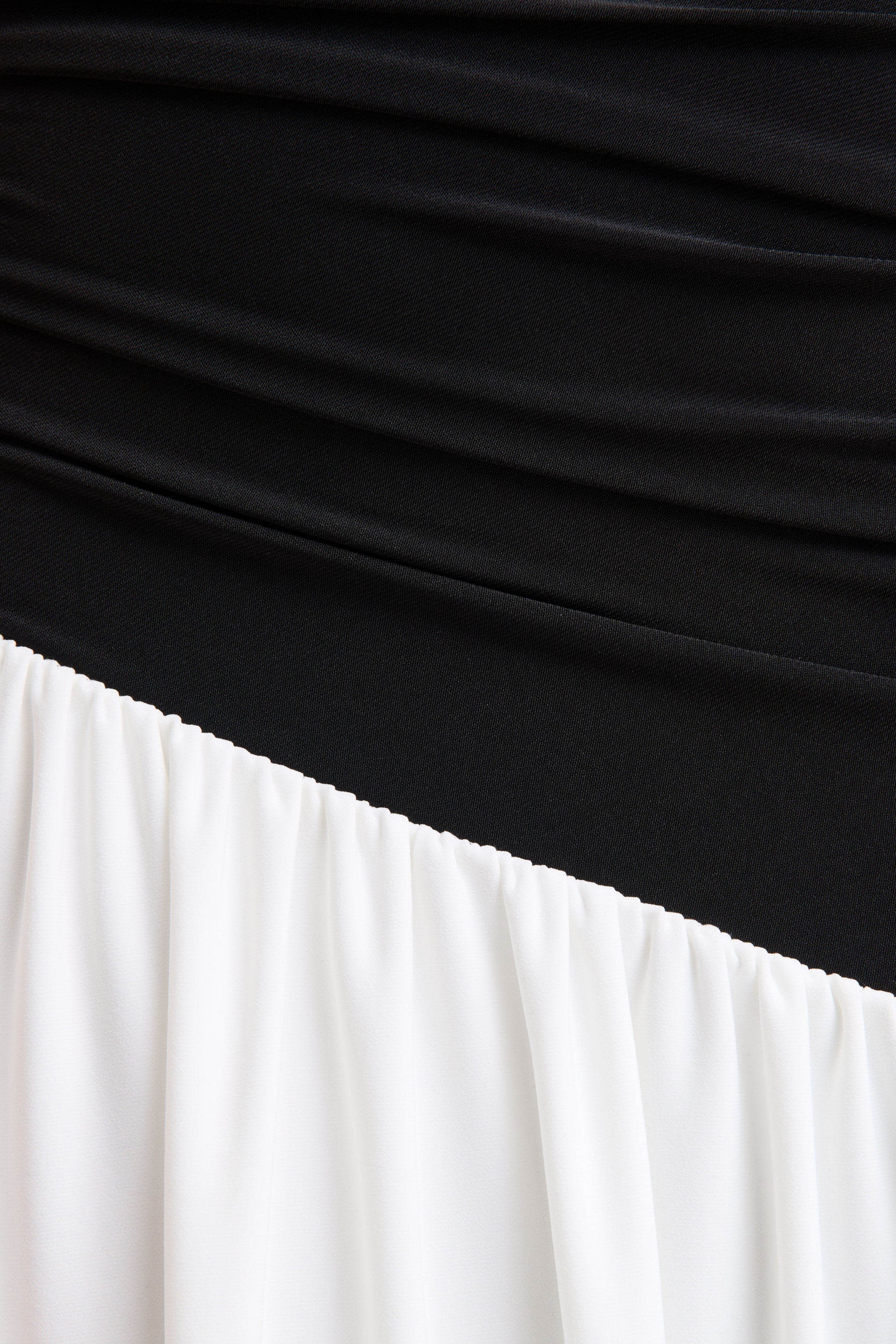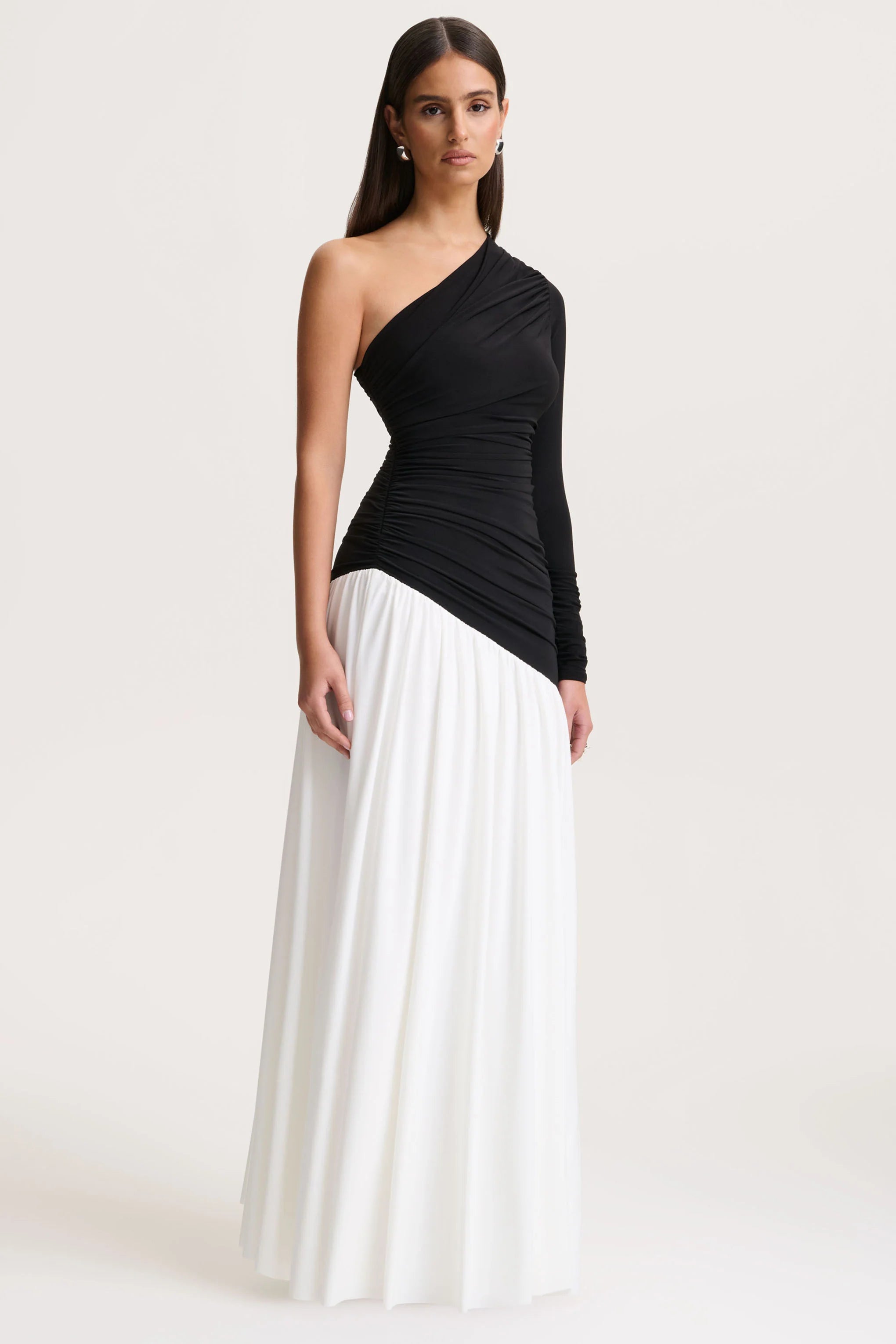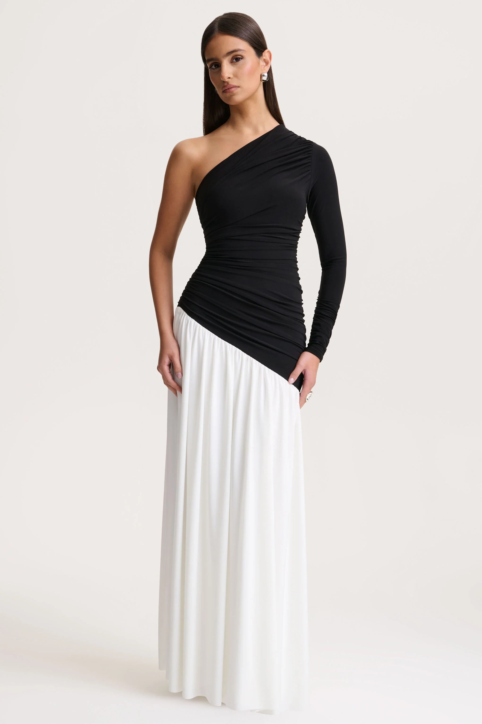 Danila blends modernity with effortless sophistication. Crafted from our premium black-and-white stretch jersey, this maxi dress contours the silhouette with smooth ease. An asymmetric neckline, gathered detailing, and a striking drop-waist create dynamic movement and contemporary allure. Bold, elegant, and refined, Danila makes a statement with minimal effort.