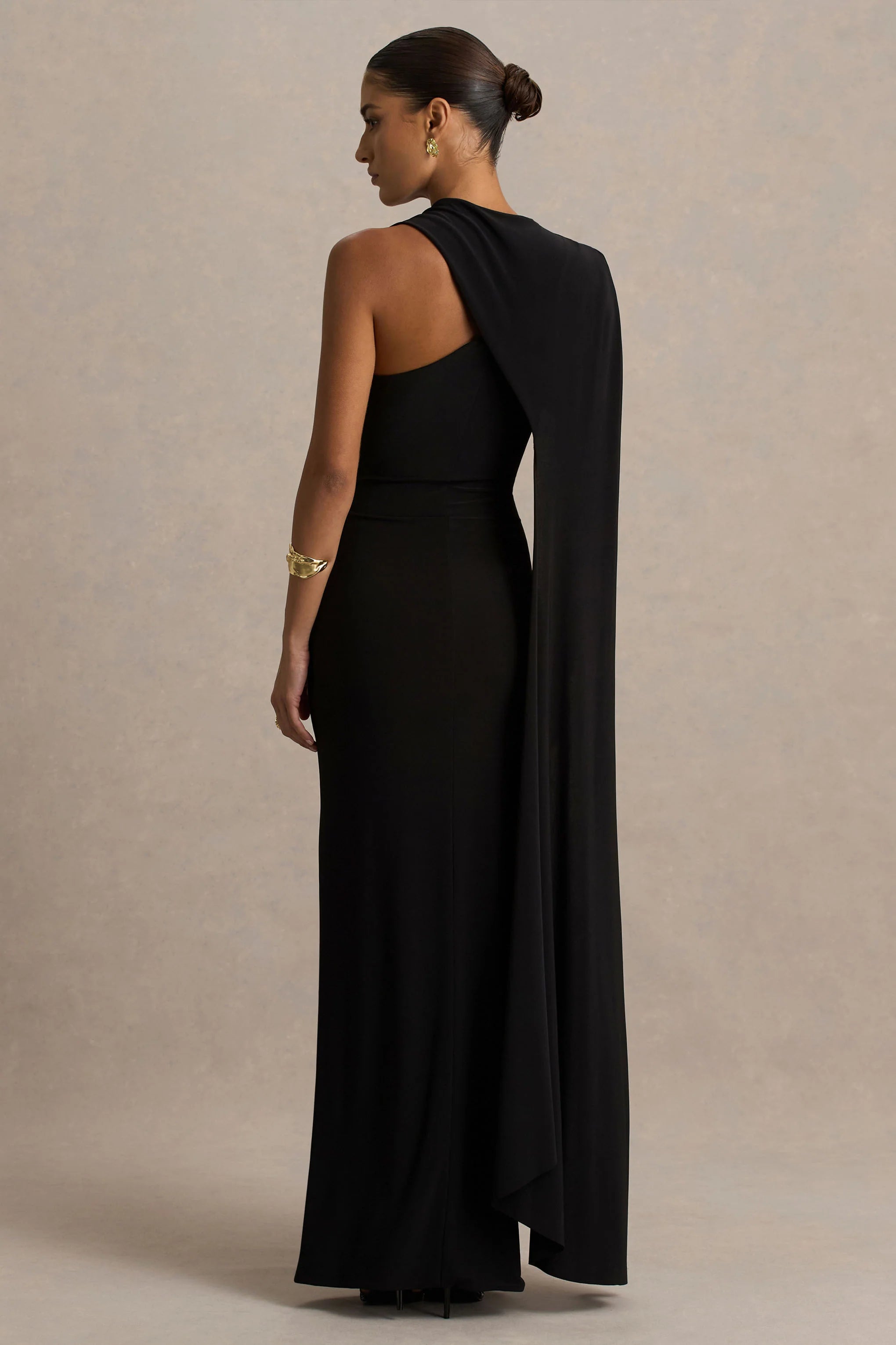 Graceful with a touch of drama, Dawn is your go-to for sleek sophistication. Cut in a rich black hue of our premium stretch jersey, this maxi dress smooths and sculpts the figure seamlessly. The asymmetric neckline creates a clean, structured silhouette, elevated by a single cape sleeve that moves effortlessly with every gesture. Dawn is classic elegance with a modern edge, perfect for any dressed up event this season.