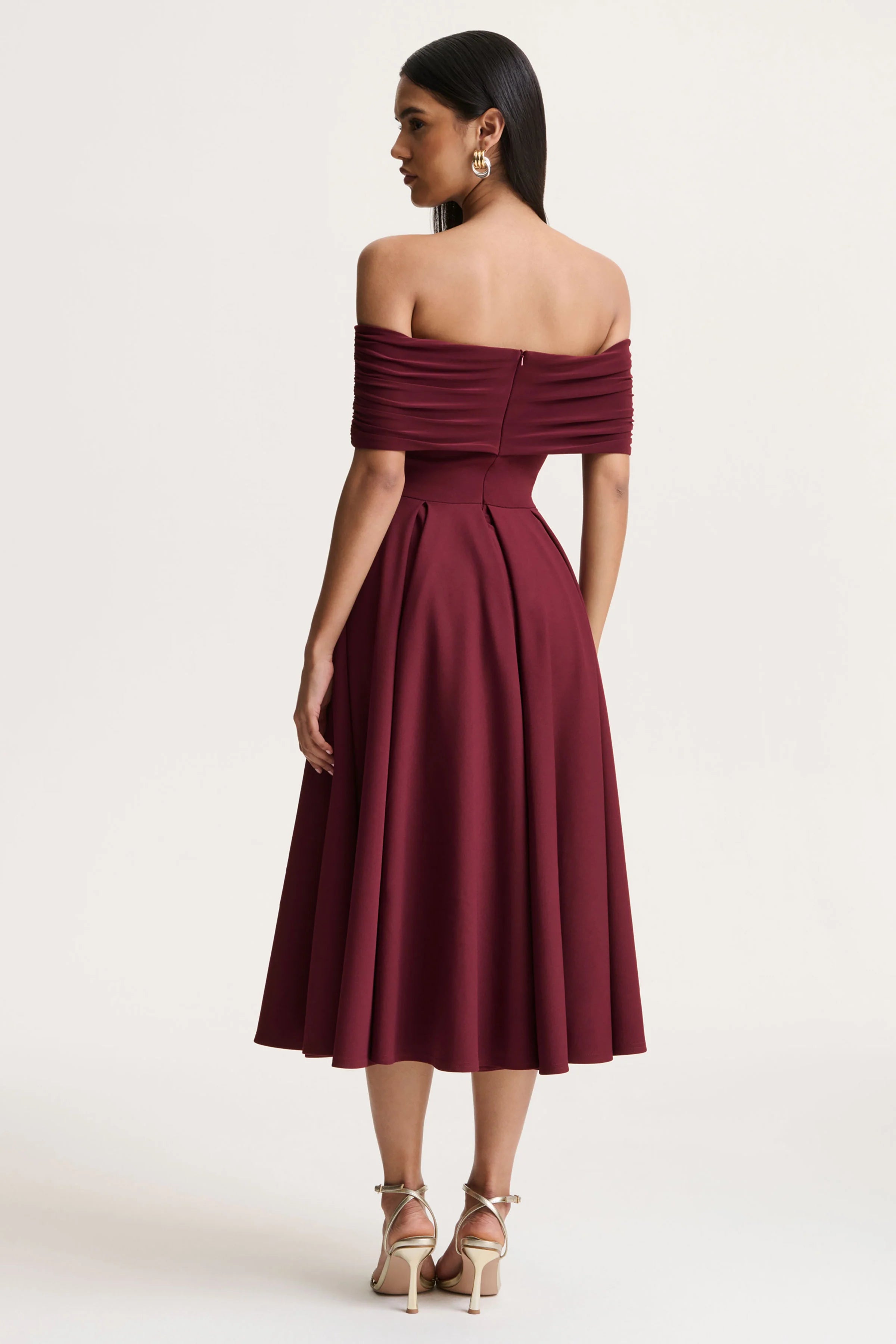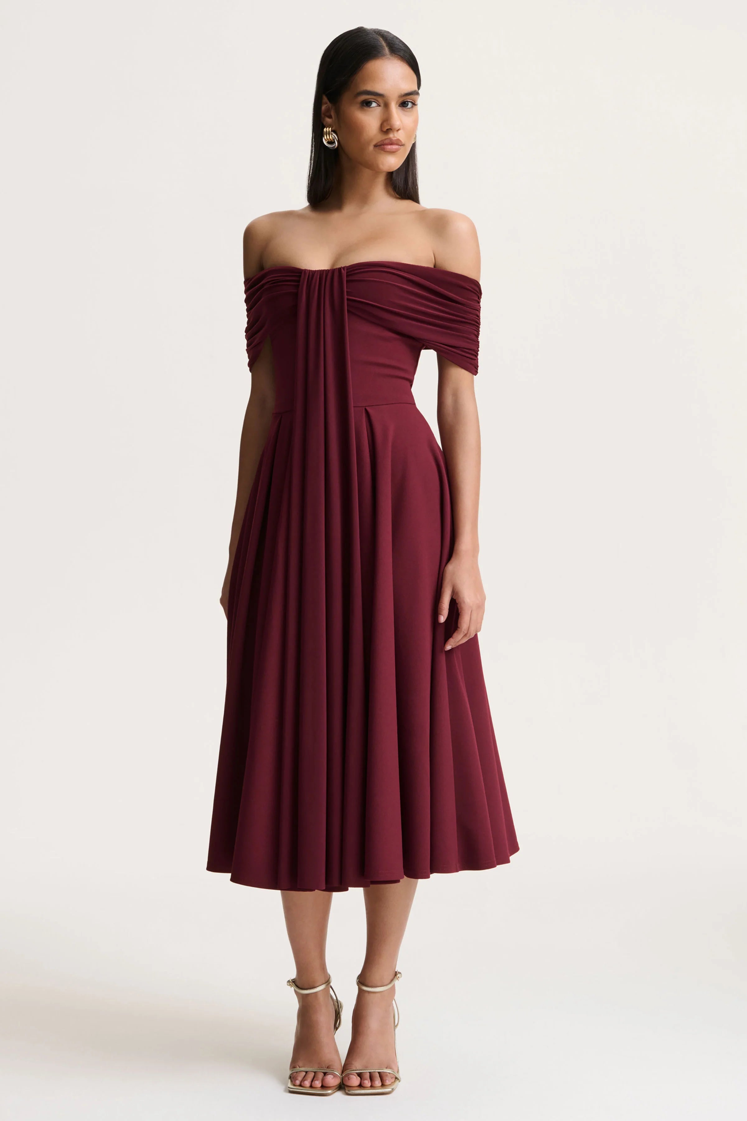 Dearest captures timeless romance with soft, sculpted elegance. Crafted from our premium burgundy scuba crepe, this midi balances structure with fluid movement. The bardot neckline gracefully frames the shoulders, while a central sash detail adds gentle draping that enhances the silhouette with refined femininity. A pleated skirt completes the look, creating volume and effortless flow with every step. Sophisticated, charming, and endlessly flattering, Dearest is a timeless classic you need in your wardrobe rotation.