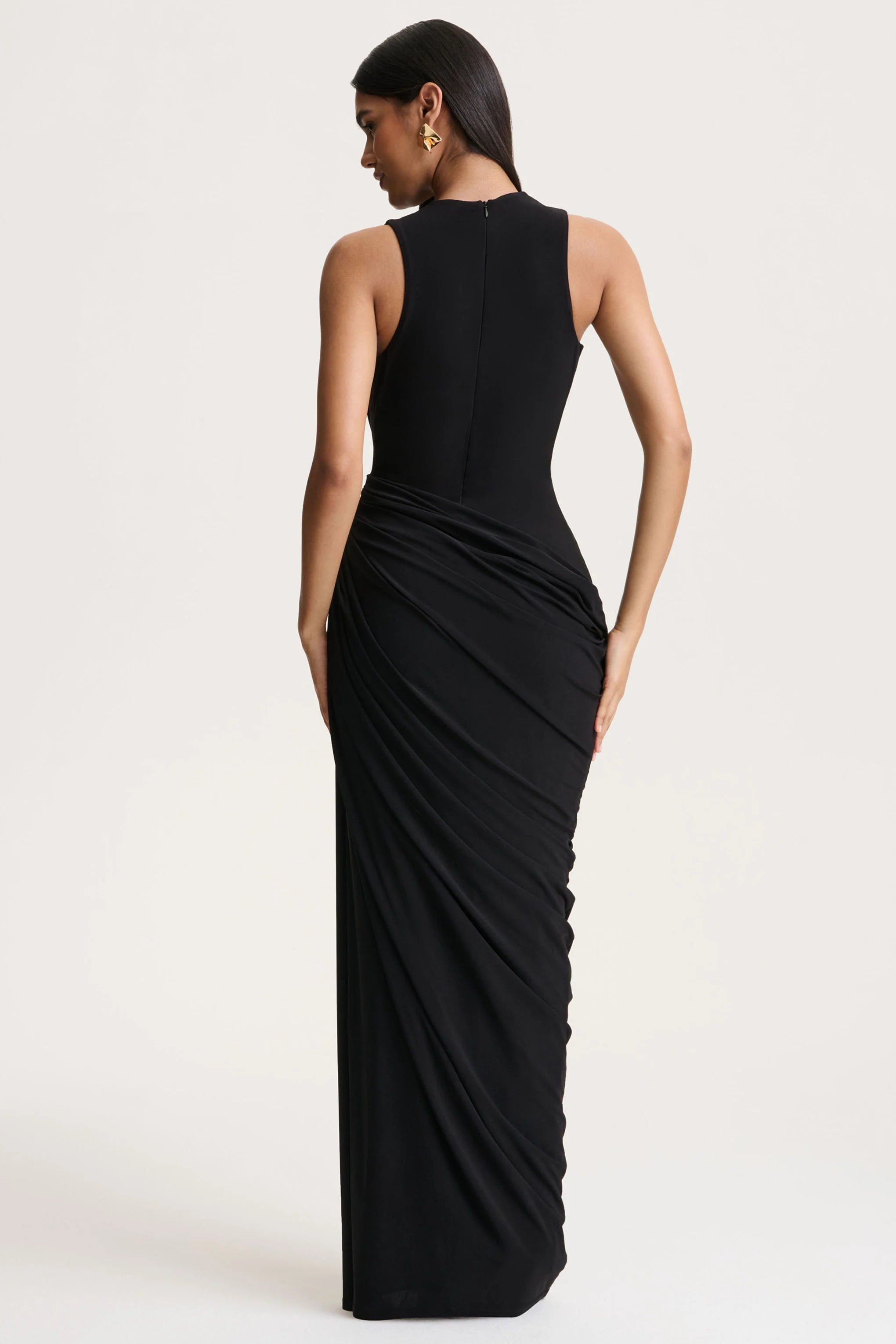 Desiree embodies fluid glamour with a sleek, sculpted finish. Crafted from our premium black stretch jersey, this maxi-length design contours the silhouette with effortless elegance. The plunge neckline creates a striking, feminine focal point, while draped and gathered detailing add depth and softness. Designed to turn heads with every step, Desiree is made for moments that call for confidence, allure, and timeless sophistication.