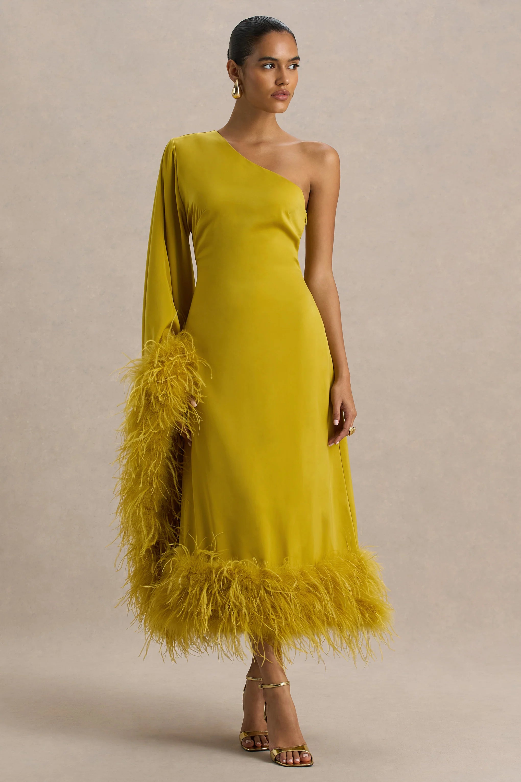 Destiny was made to command attention with striking elegance and elevated detail. Crafted from our premium yellow satin, this fluid midi dress skims the body with a lustrous, flattering finish. The asymmetric neckline and single kimono-style sleeve creates a bold, sculptural silhouette, while the feather trim adds a touch of modern drama. Designed to stand out, Destiny will be your statement look for every unforgettable occasion.