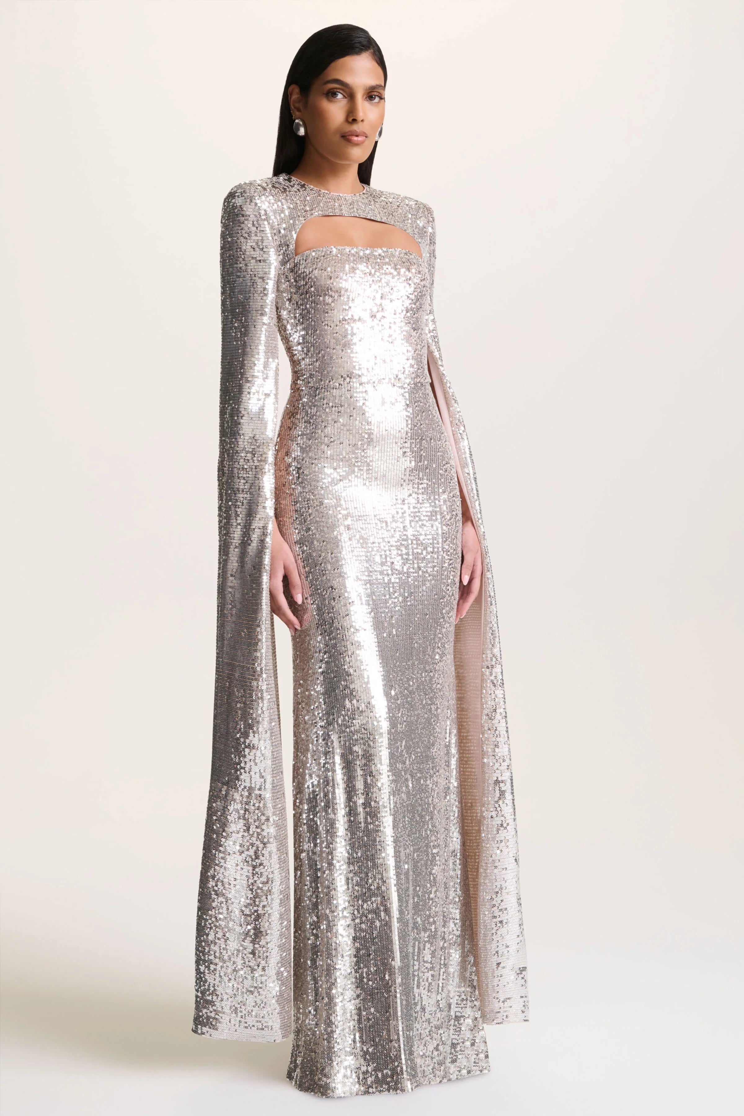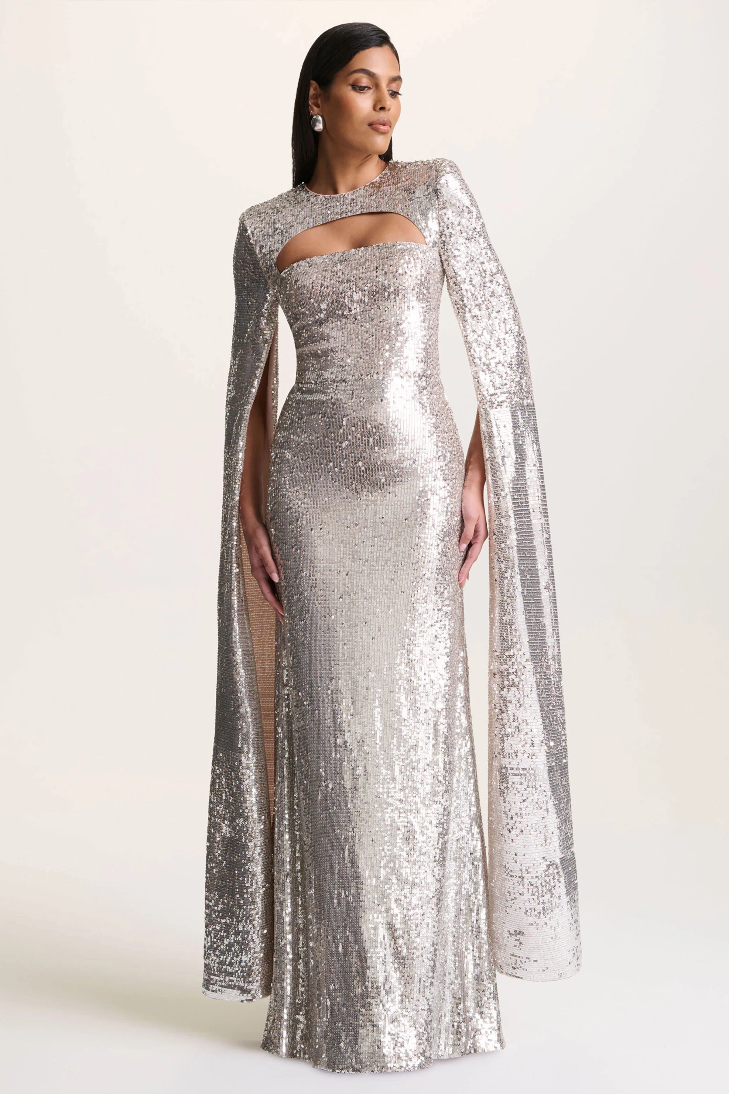 Say hello to Devora, a statement maxi designed to captivate from every angle. Cut from premium silver sequins, this show-stopping style is the head-turner you need. Designed with a sleek crew neckline that balanced by daring cut-out details for a modern edge. The dramatic cape sleeves cascade to the floor, creating striking movement with every step. Devora is the perfect fusion of glamour and sophistication, made for nights where all eyes are on you.