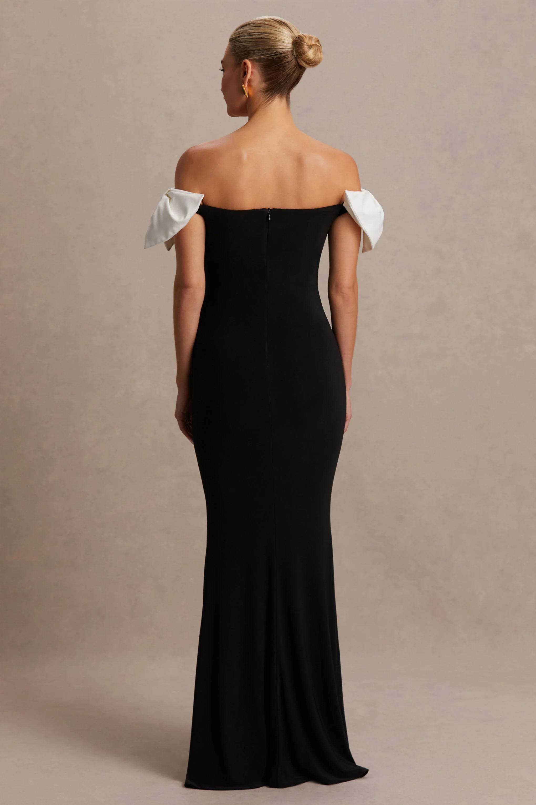 Introducing our latest maxi, designed to turn heads say hello to Didi. This gown is curated in a blend of black and white hues of our premium stretch jersey, for a sculpting and flattering fit. Featuring a delicate, feminine bardot neckline with gorgeous bow sleeve details adding a romantic touch. Completed with intricate ruched detailing, placed perfectly to enhance your figure and flatter your curves. Style Didi with gold accessories for your next evening occasion.