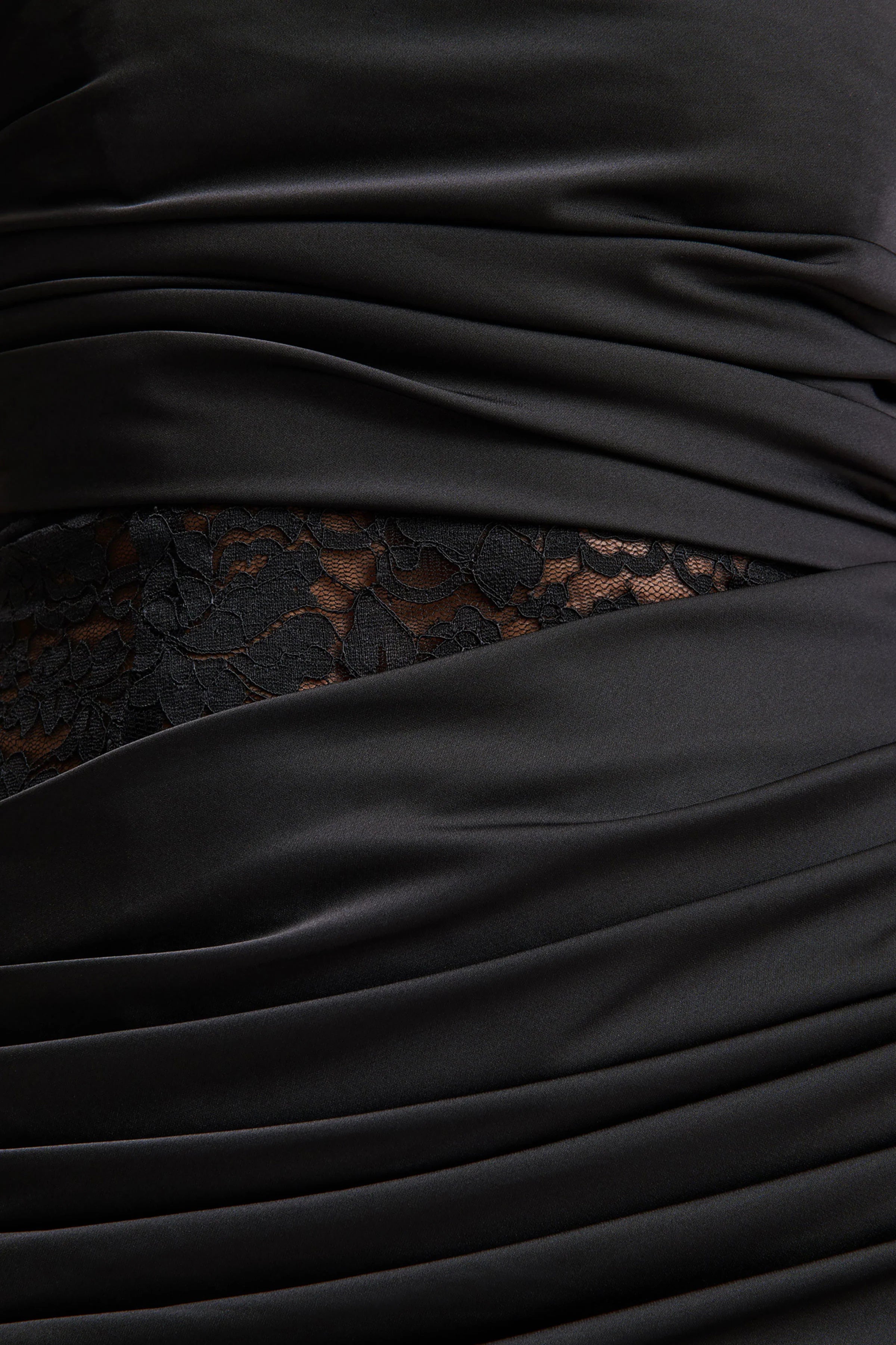 Meet Dulcie, the definition of modern elegance with a touch of timeless allure. Crafted from our premium lace and satin in a sleek black hue, this midaxi dress exudes sophistication from every angle. The bandeau neckline creates a flattering, feminine silhouette, while gathered asymmetric panels sculpt the figure beautifully. Finished with a side split for graceful movement, Dulcie is the ultimate choice for evenings that call for effortless glamour.