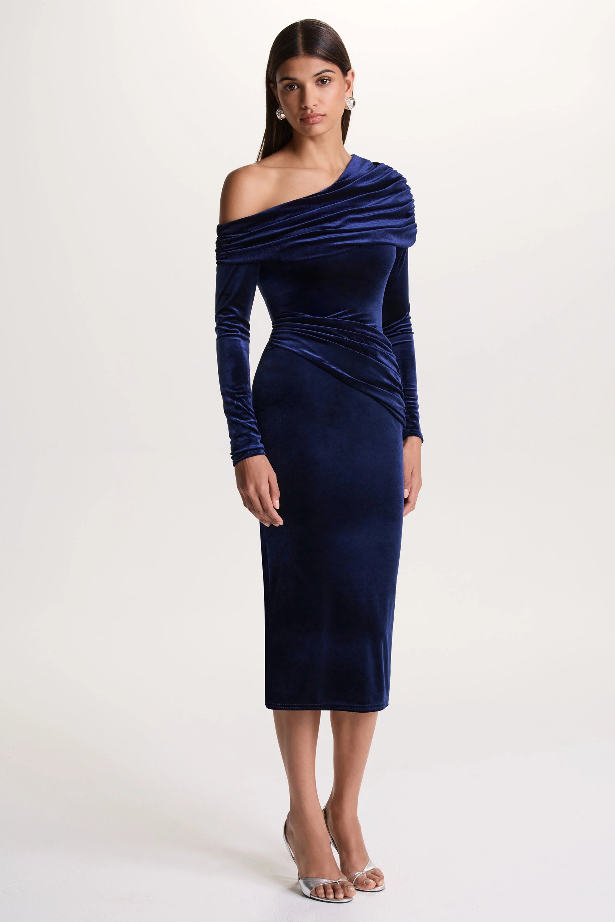 Eirene radiates effortless elegance with a modern twist. Crafted from our premium velvet in a rich blue hue, this midi dress beautifully contours the silhouette. The asymmetric neckline adds a contemporary edge, while the gathered detailing enhances every curve with soft sophistication. Eirene is made for evenings that call for timeless style with a head turning finish.