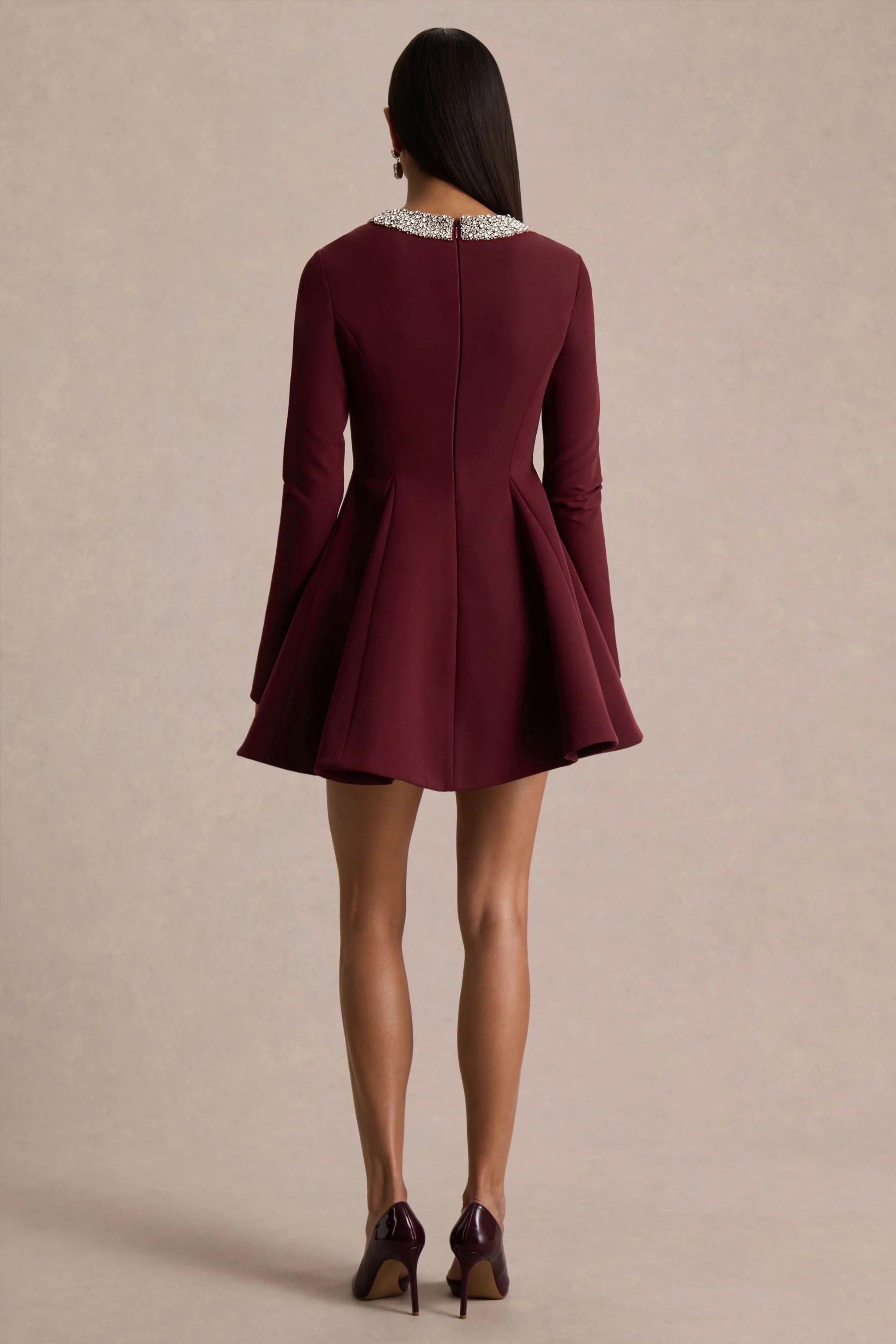 Say hello to Eletta, the ultimate mini dress for flirty sophistication. Crafted from our premium burgundy crepe, this skater-style mini flatters the figure with effortless movement and shape. The embellished crew neckline brings a touch of glamour, while long sleeves add chic, refined elegance. Complete with a playful skater skirt, Eletta is your go-to for a modern take on evening dressing.