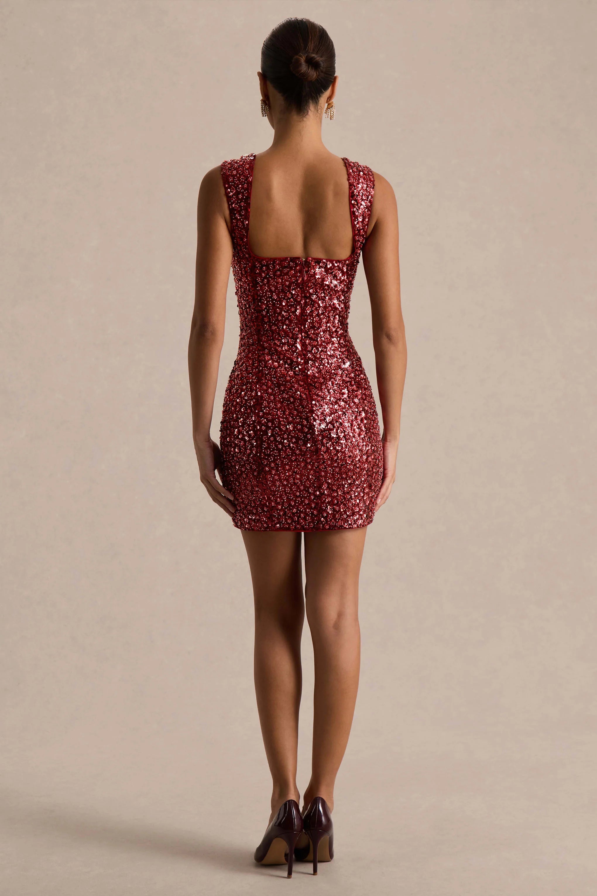 Make a statement in Elettra, your ultimate party-ready showstopper. Crafted in our premium burgundy sequin, this mini dress features a chic square neckline and a daring front split for maximum drama. Perfect occasion where you want to turn heads, Elettra is all about bold, confident glamour.