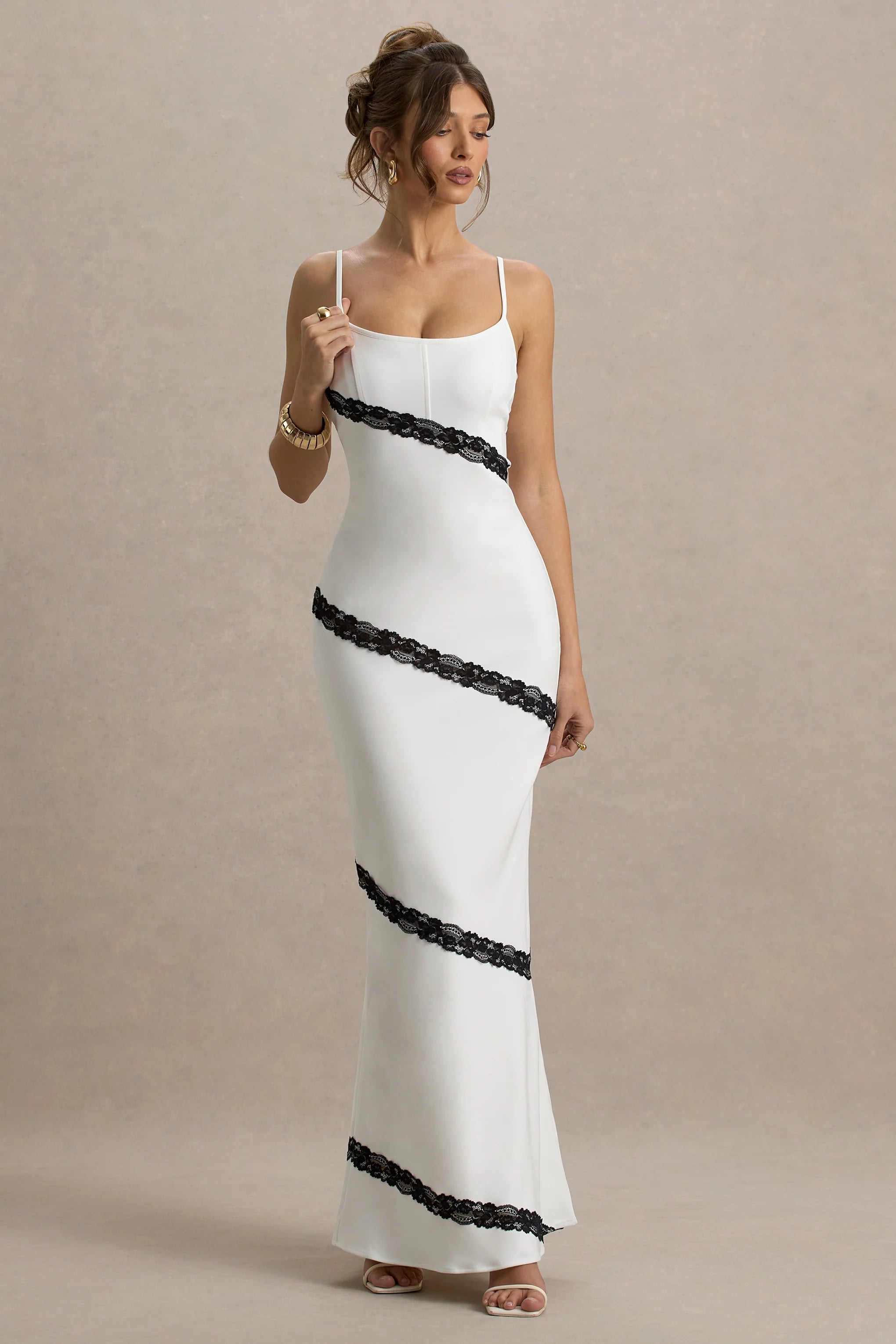 Say hello to summer elegance in Elizabeth, our strappy cami maxi dress. Crafted in our premium buttery crepe in a glowing white, this style is contrasted by black lace trims that add a touch of romance. Whether it's the Amalfi Coast or a garden party, this classic dress will be sure to make you the centre of attention