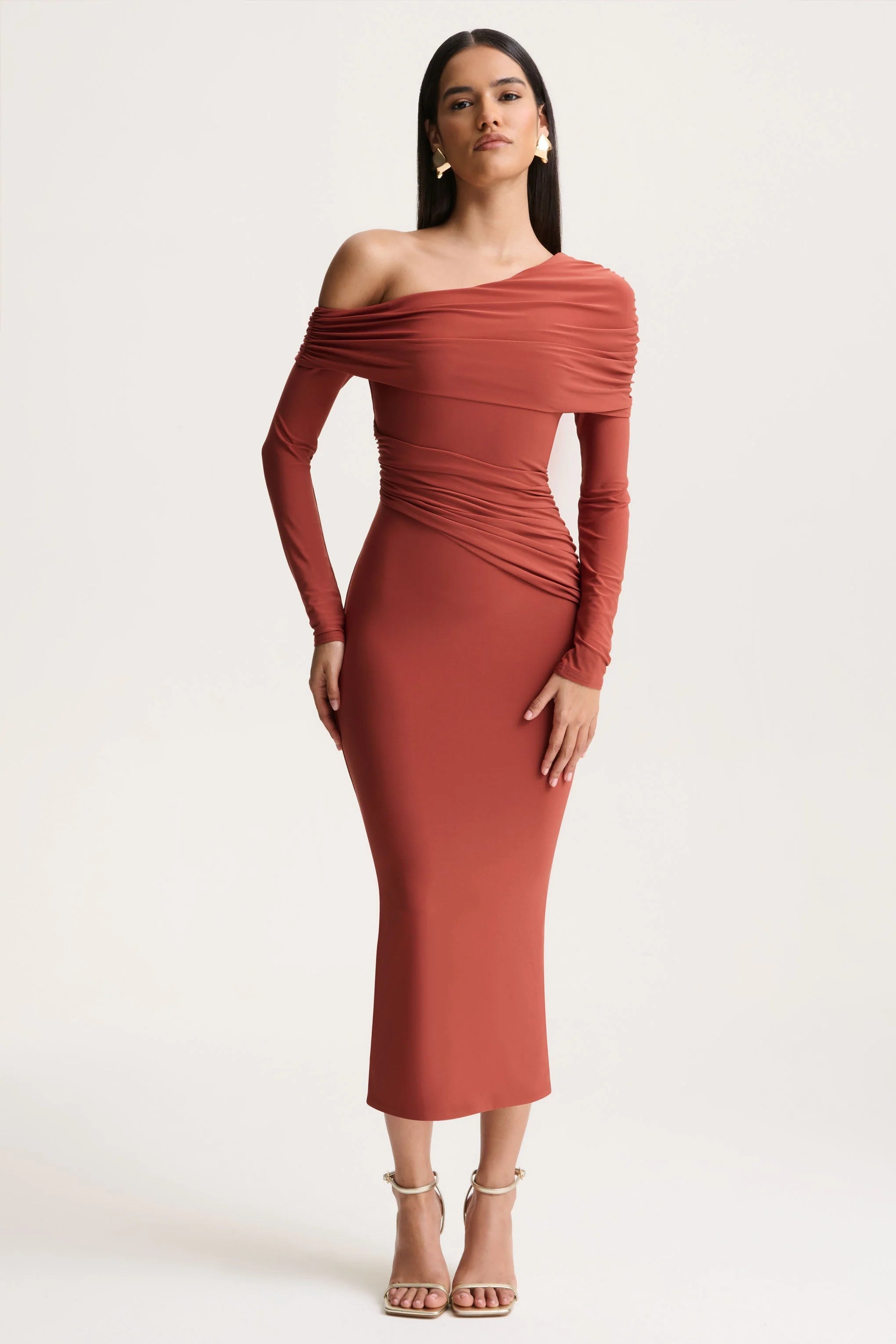 Elliora channels modern sophistication with a sculpted, feminine finish. Crafted from our premium stretch jersey in a warm rust hue, this midi-length design contours the silhouette with effortless ease. The asymmetric neckline creates a striking, contemporary focal point, while the ruched detailing enhances every curve with soft definition. Finished with a centre-back split for graceful movement, Elliora is made for occasions that call for confidence, elegance, and understated glamour.