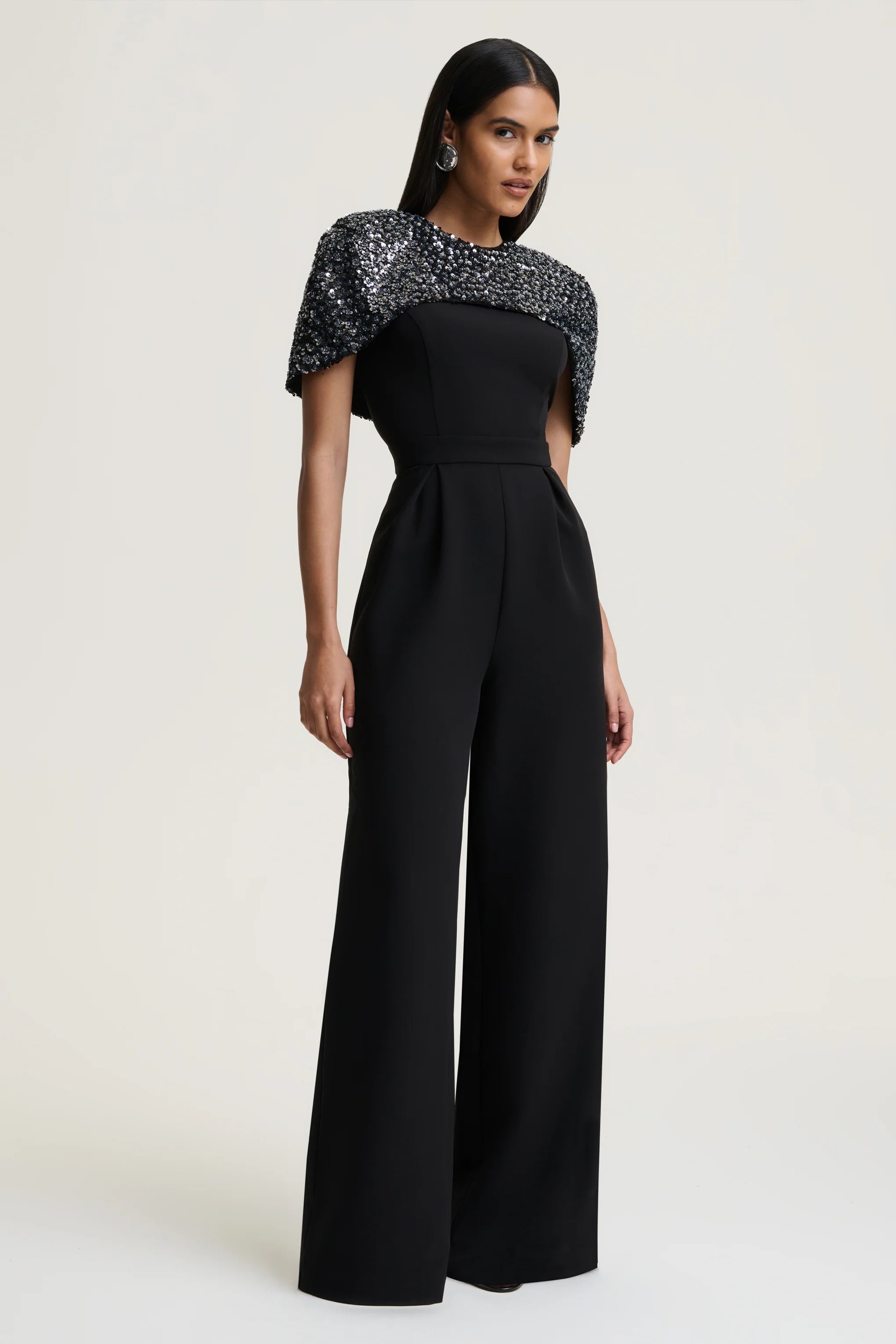 Turn heads wherever you go in the stunning Eloriana your ultimate statement piece for unforgettable nights. Crafted in our black premium crepe, this jumpsuit in a sleek, elegant hue exudes sophistication and allure. The high neckline adds a touch of refined glamour, while the hand-embellished cape sleeves bring drama. Perfect for Eloriana is the epitome of chic, modern elegance.