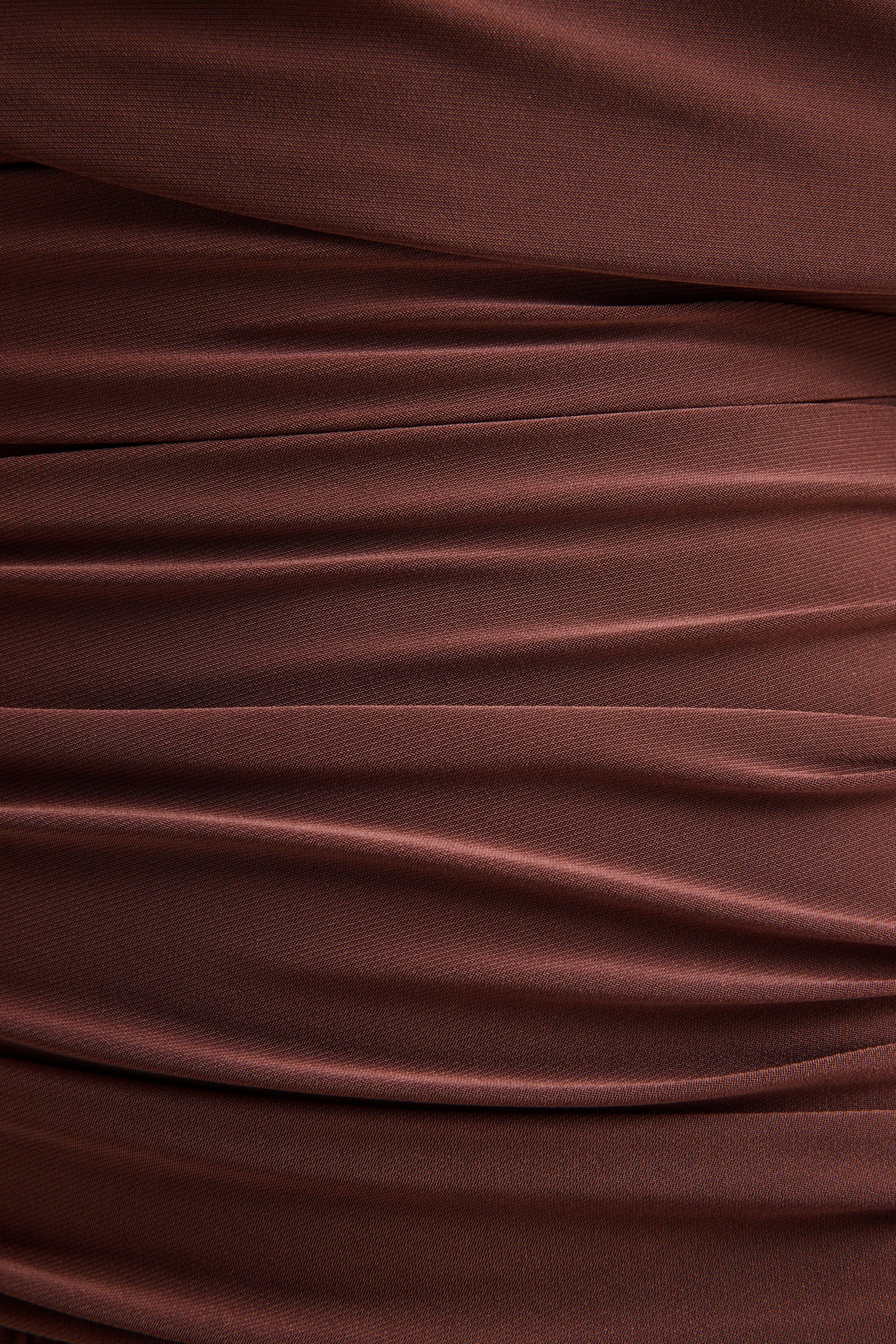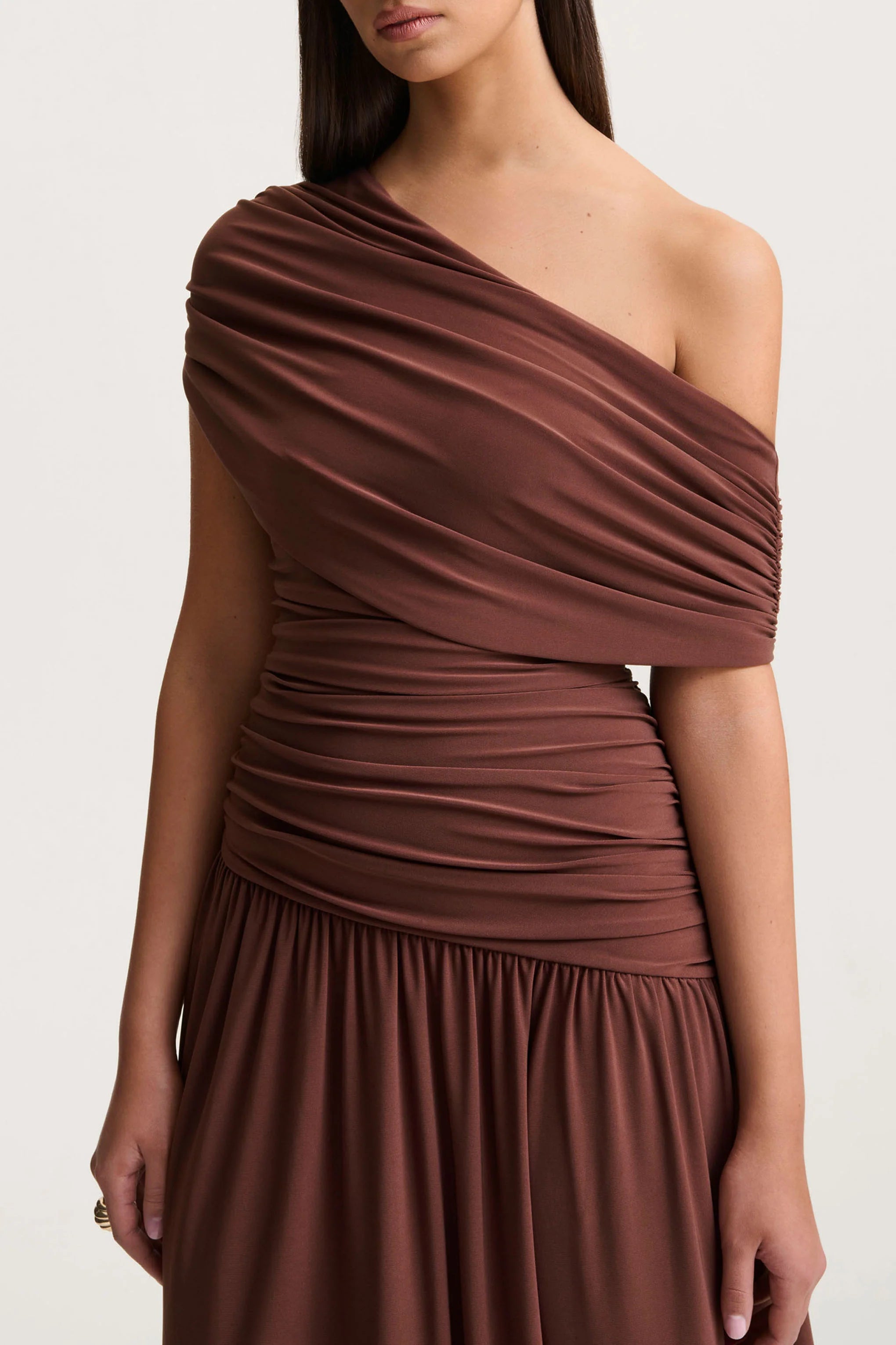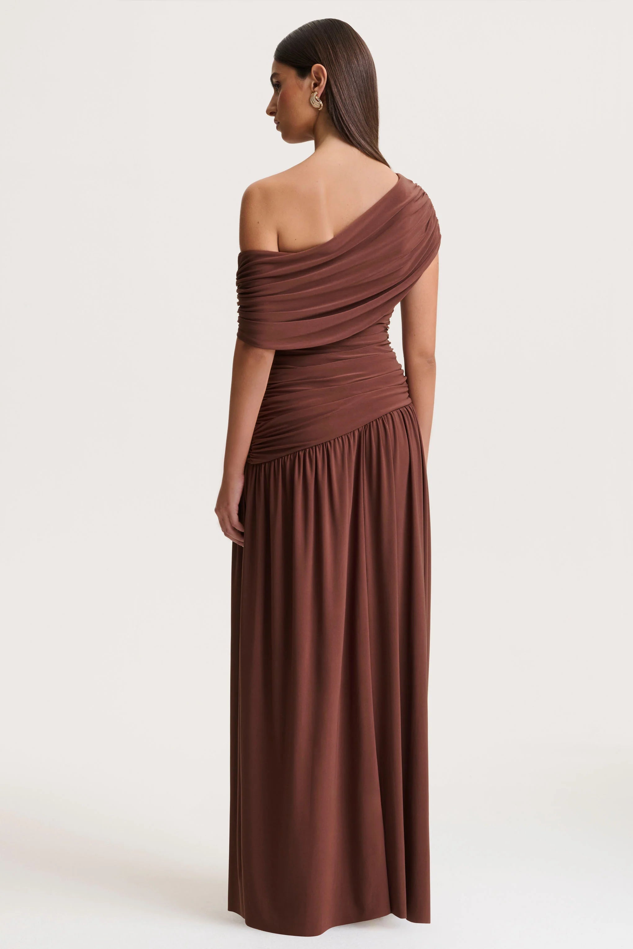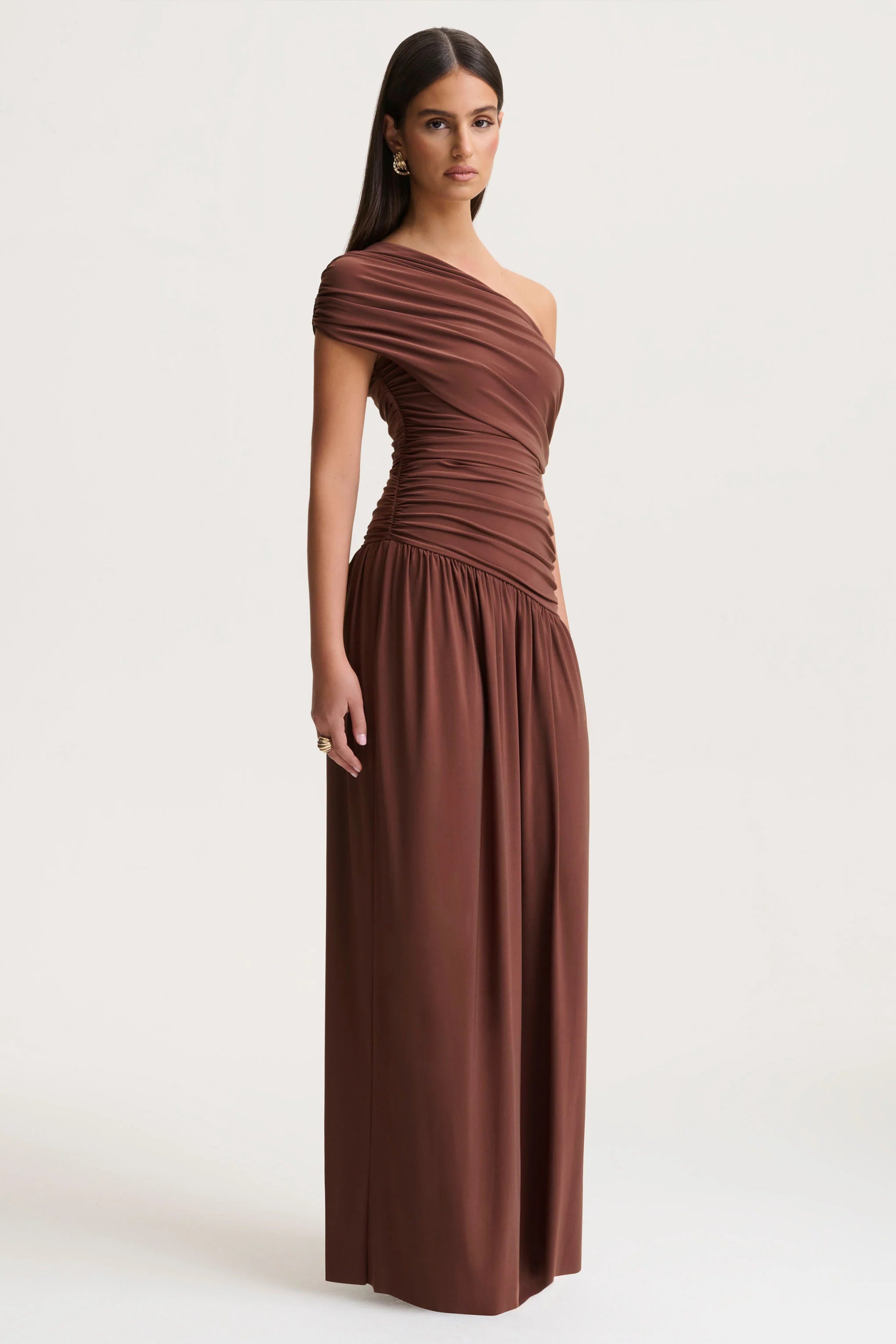 Emberly is the perfect blend of modern contouring and effortless elegance. Crafted from our premium stretch jersey in a rich brown hue, this maxi-length design smooths and sculpts with ease. The draped asymmetric neckline adds a striking, contemporary touch, enhanced by subtle ruched detailing that draws the eye. Finished with a relaxed drop waist for soft definition, Emberly is made for moments that call for understated glamour and confident sophistication.