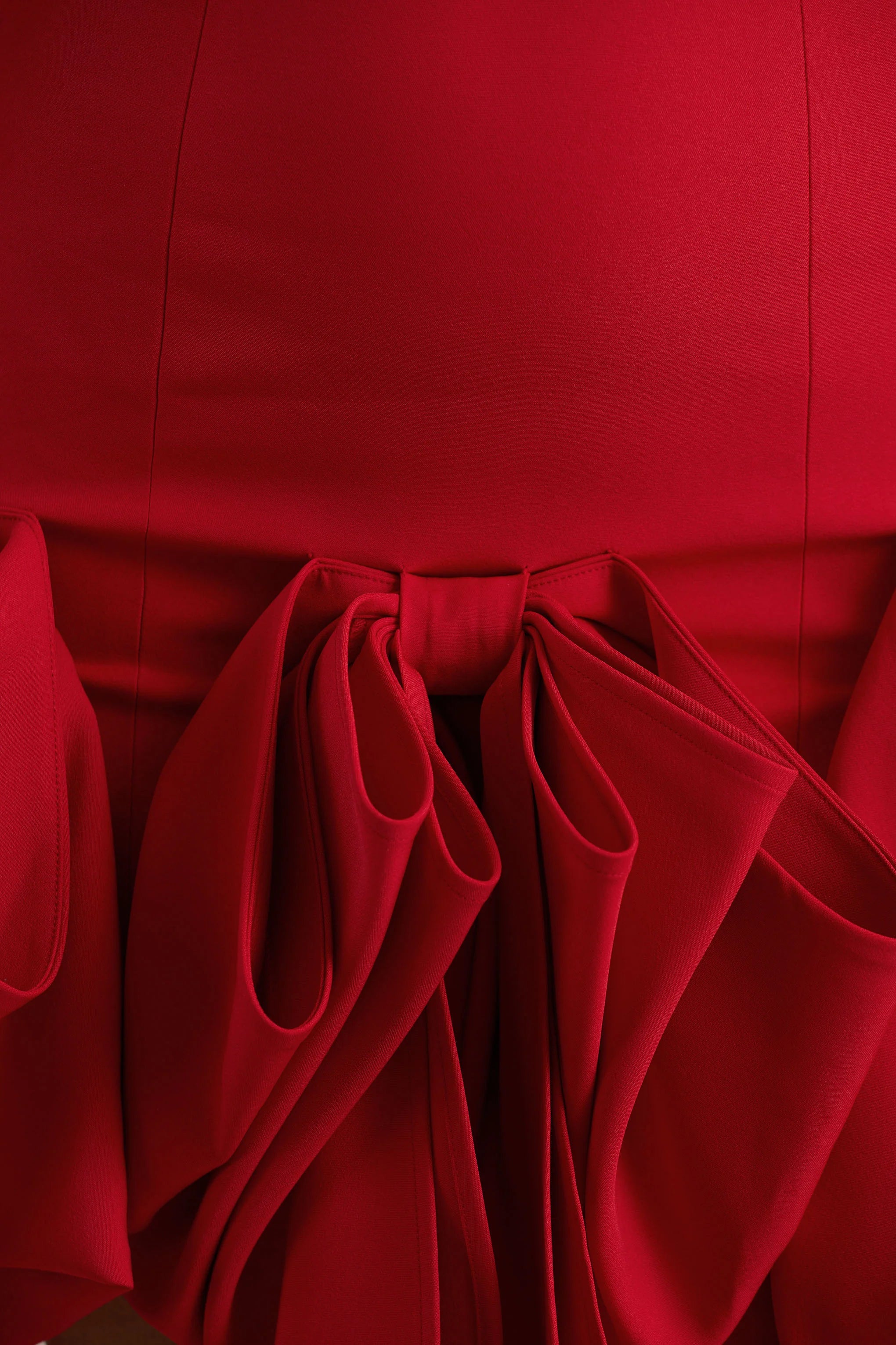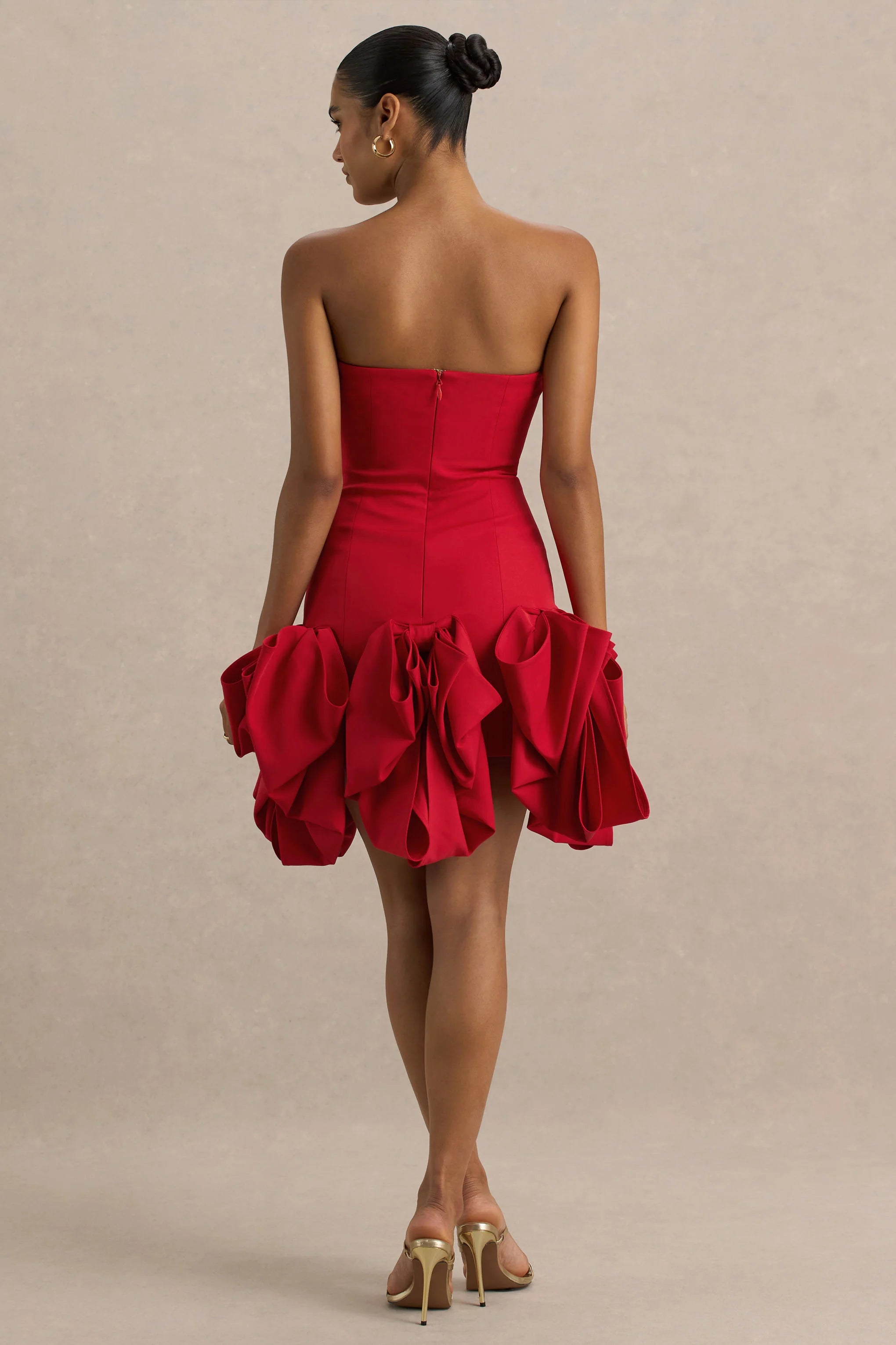 Flirty, feminine and adorned with detail, Erica is the ultimate piece for your next special occasion. Crafted in a bold red hue of our premium stretch crepe, this mini hugs your curves in all the right places. Designed with a corseted bodice, for the ultimate figure enhancing fit, and a bandeau neckline that elegantly frames your shoulders. In Erica your silhouette will be flattered from all angles. Finished with a statement puff-ball skirt crafted from striking bow detailing, adding a playful and chic edge to elevate your whole look. From date nights to girls night, be prepared to turn heads.