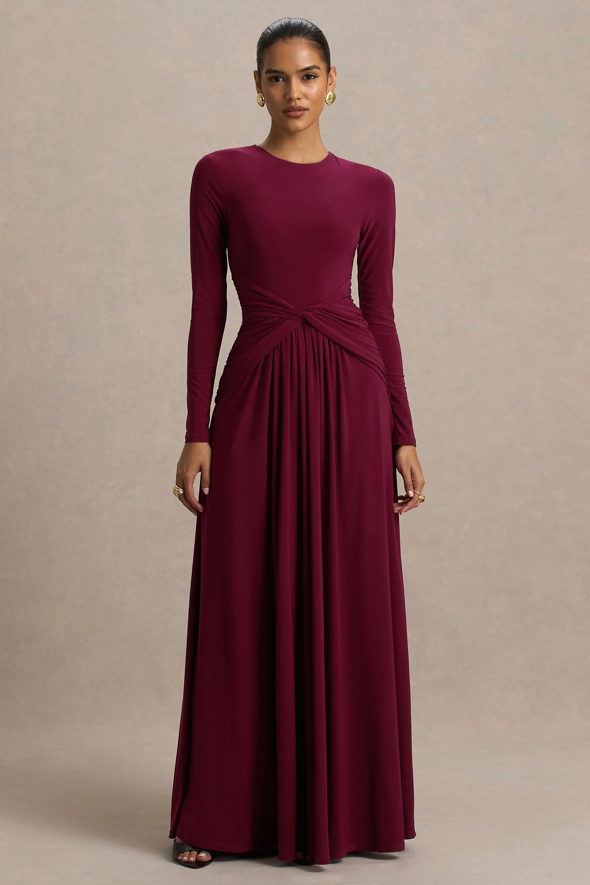 Make a sleek and refined statement at your next VIP moment in Estrella. Designed in a rich berry hue of our premium stretch jersey, this maxi gorgeously sculpts your silhouette before flowing into a floor sweeping skirt that moves effortlessly with every turn. The high neckline and long sleeves give this piece an understated, chic feel that is complimented by the figure flattering wrap and ruched detailing. Style with bold earrings and sleek heels, for a head-turning outfit.