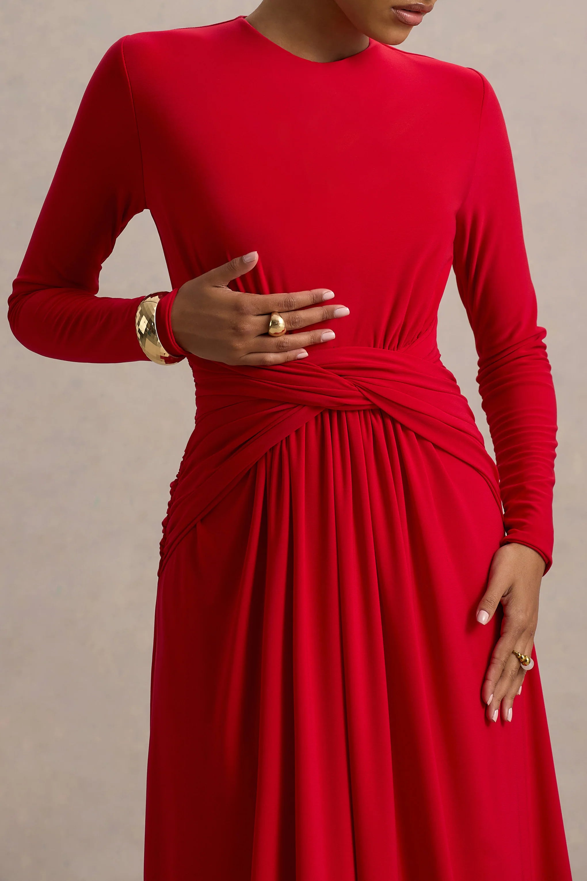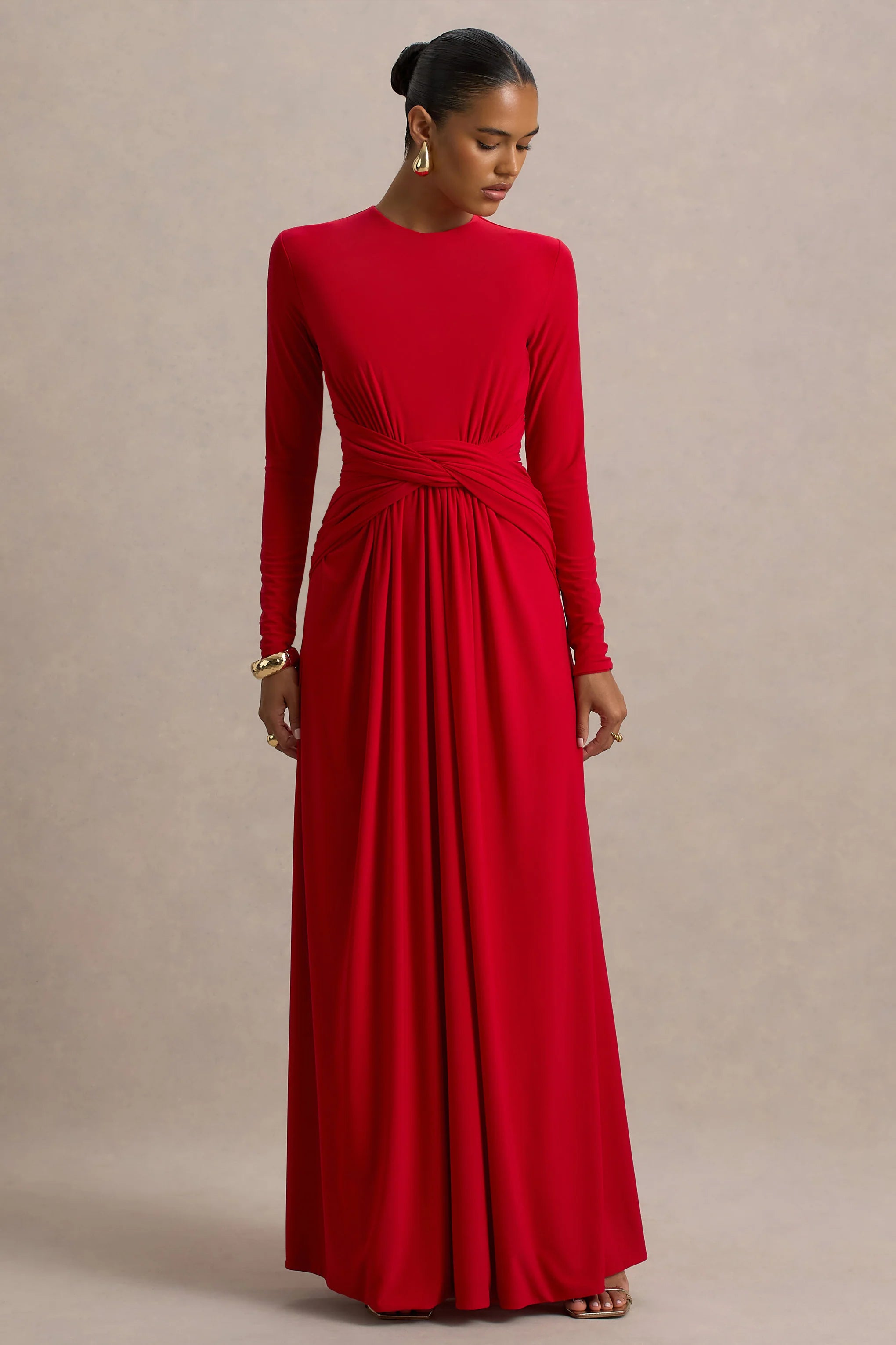 Make a sleek and refined statement at your next VIP moment in Estrella. Designed in a rich red hue of our premium stretch jersey, this maxi gorgeously sculpts your silhouette before flowing into a floor sweeping skirt that moves effortlessly with every turn. The high neckline and long sleeves give this piece an understated, chic feel that is complimented by the figure flattering wrap and ruched detailing. Style with bold earrings and sleek heels, for a head-turning outfit.