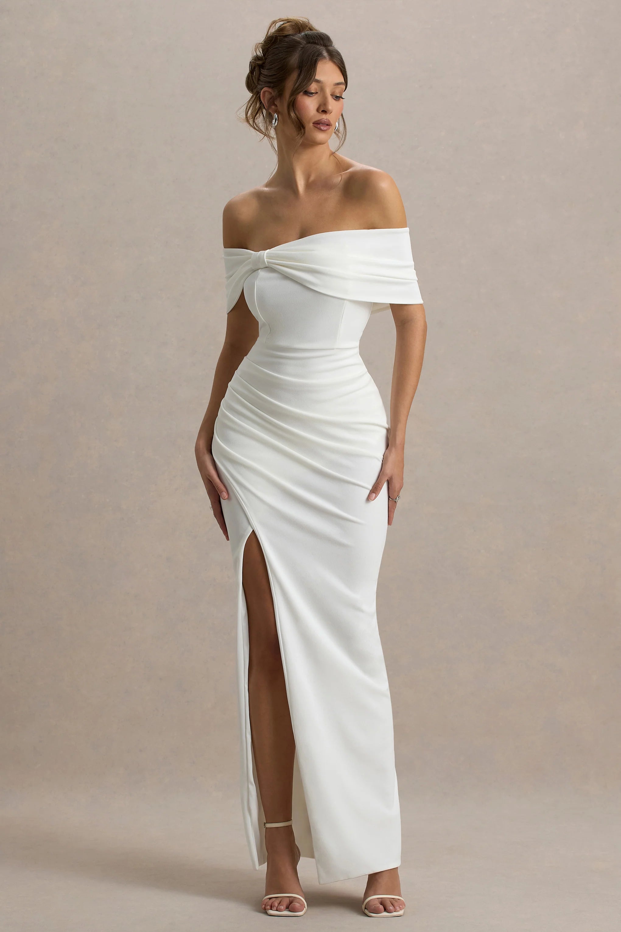 Meet Eva, the showstopping maxi for your next special occasion in a bright white fabric that's guaranteed to catch eyes. Sophisticated in both shade and silhouette, Eva features a Bardot neckline wrapped by a large bow and split wrap skirt. Each one of the dress' fine details is made to frame your feminine curves so you can look and feel your best at any formal event.