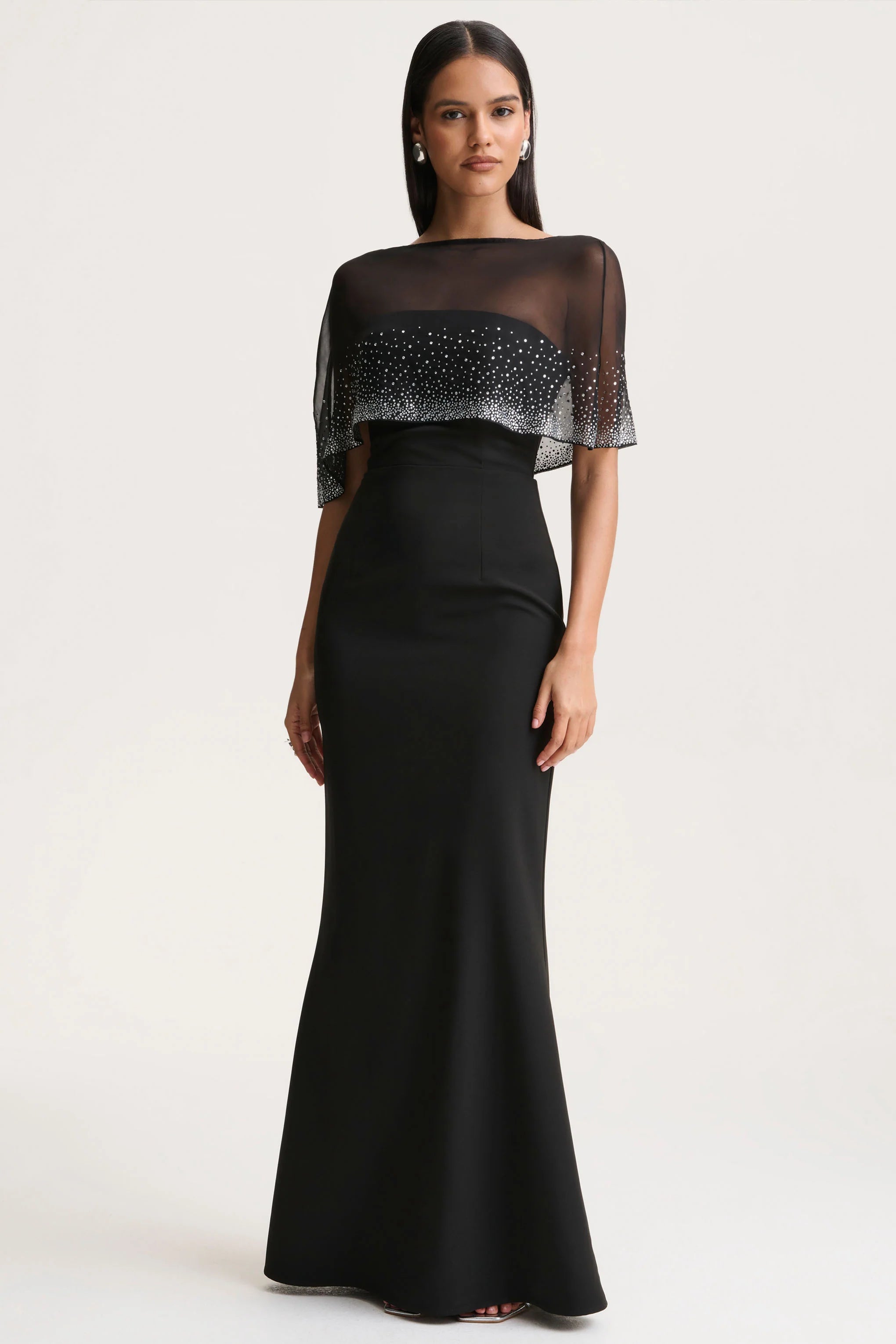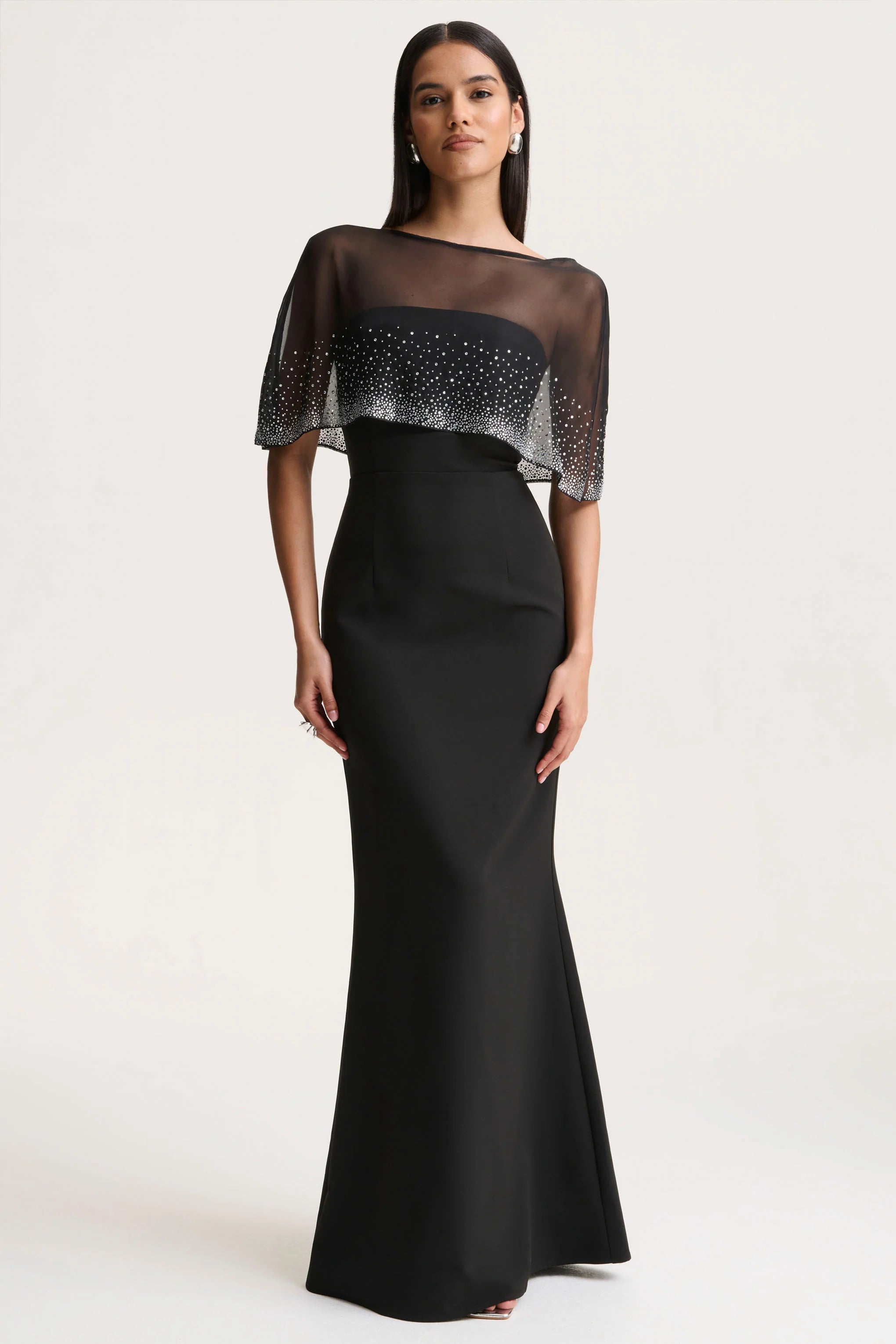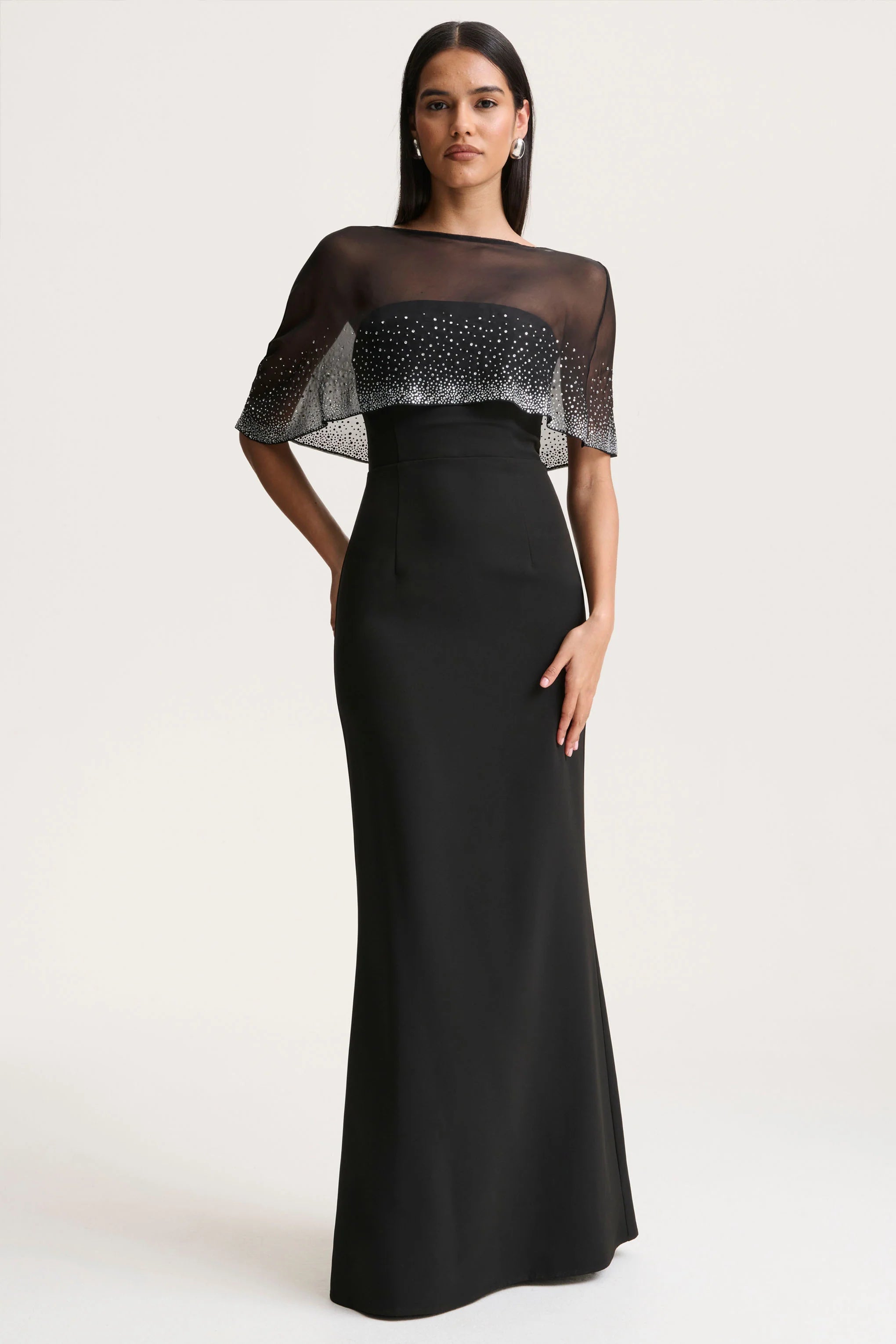 Step into effortless sophistication with Everly. Crafted from our premium crepe, this statement piece features a dramatic hand-embellished cape that drapes elegantly over the shoulders. The V-shape back detail adds a touch of daring allure, while the maxi length creates a fluid, graceful silhouette. Perfect for evenings where you want to be unforgettable, Everly is a show-stopping choice for modern glamour.