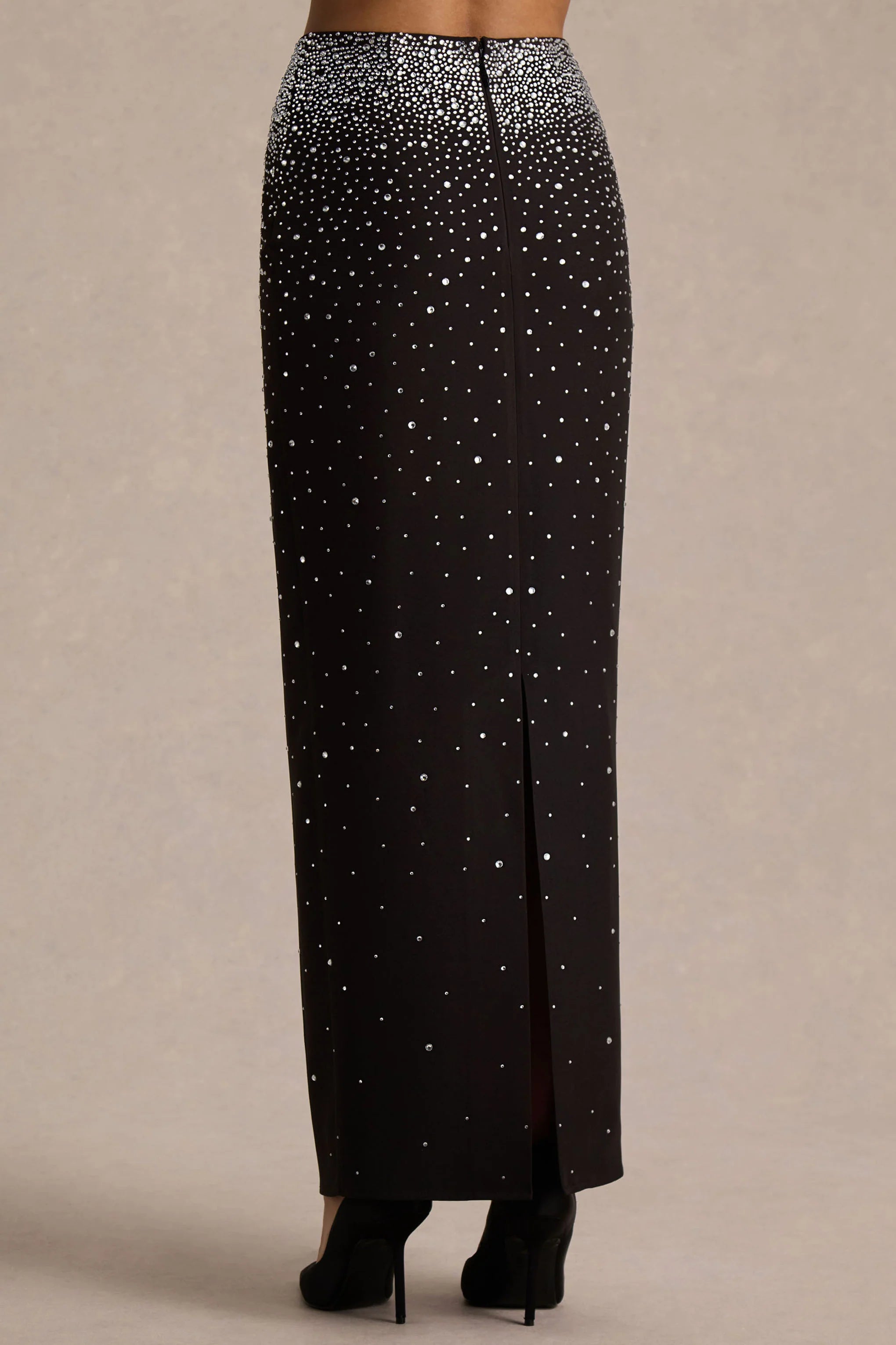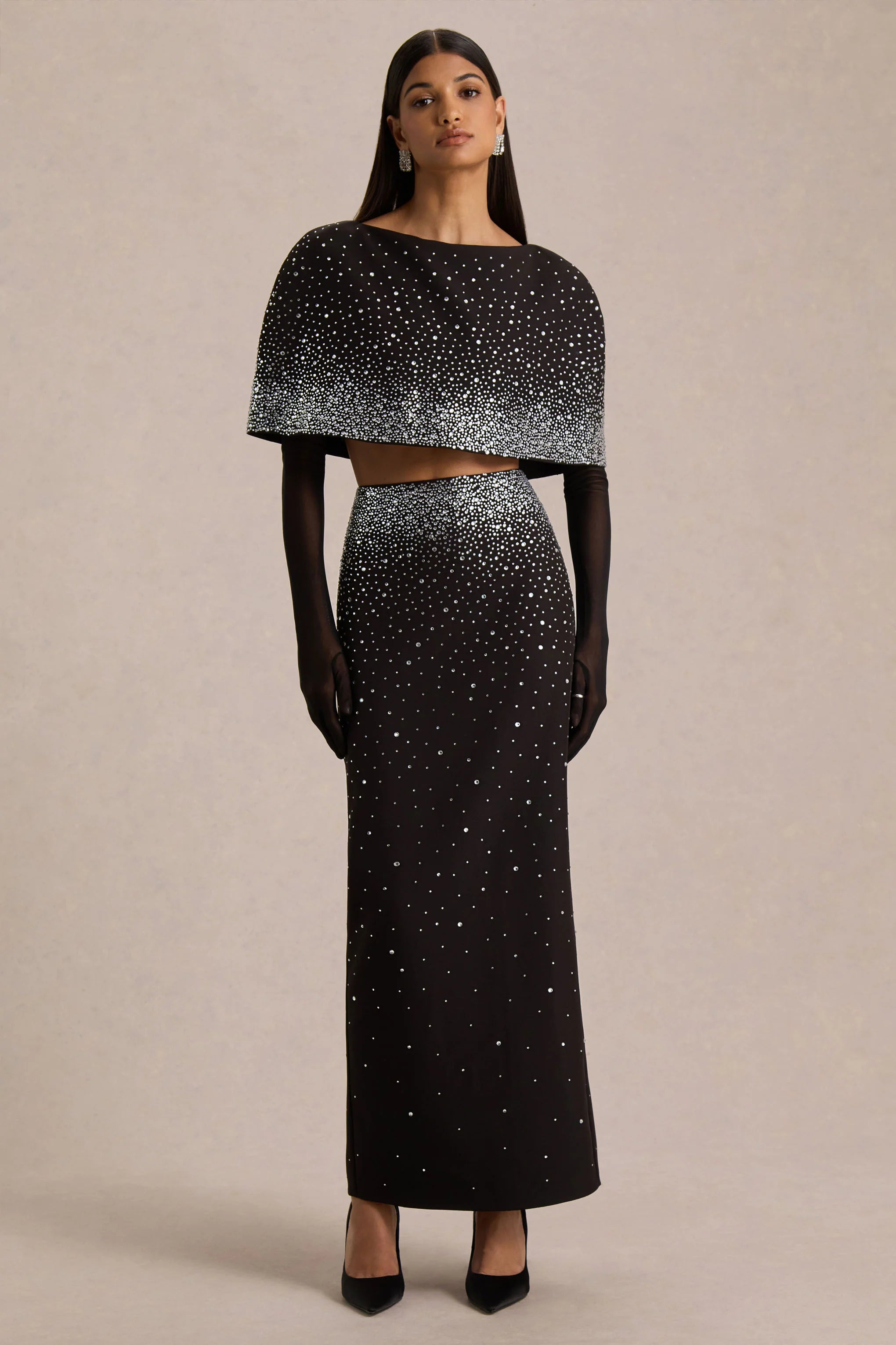 Say hello to Fabiana, a timeless statement skirt designed to shimmer with sophistication. Crafted from our premium black crepe, this maxi skims over your figure creating a seamless silhouette. Designed with intricate hand-embellished detailing that catches the light with every step. The sleek silhouette flatters the figure, while the centre-back split adds a touch of allure and ease of movement. Fabiana is the definition of modern evening elegance.