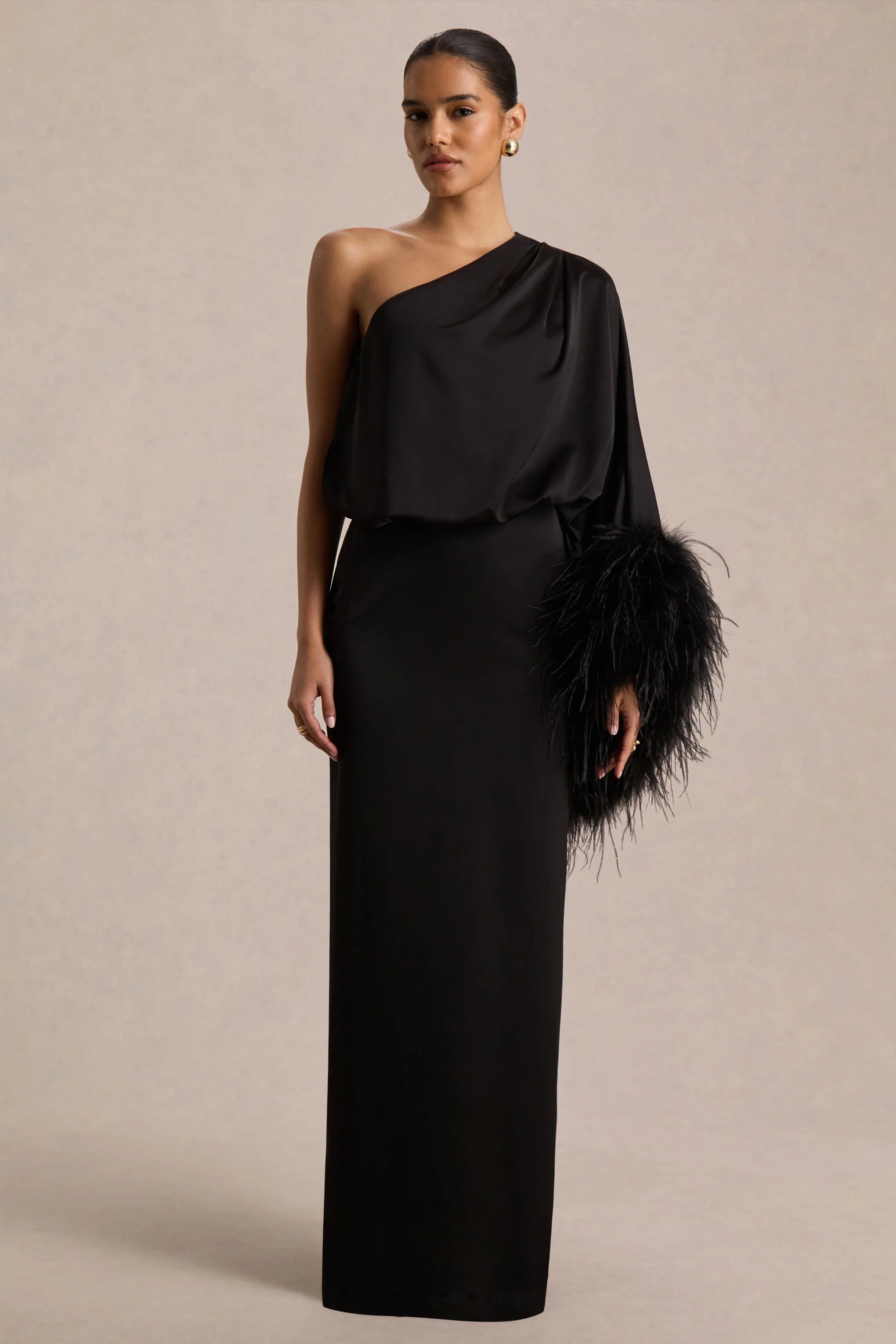 Command attention from every angle in Felicity. Crafted in our black premium satin, this maxi dress exudes elegance with an edge. The asymmetric neckline and blouson bodice sculpt a sophisticated silhouette, while the statement feather trim at the sleeves adds a touch of high-glam drama. Designed to flow with your every move, Felicity features a centre-back split for ease and allure. Whether it’s a black-tie affair or a red-carpet moment, this showstopper promises unforgettable entrances.